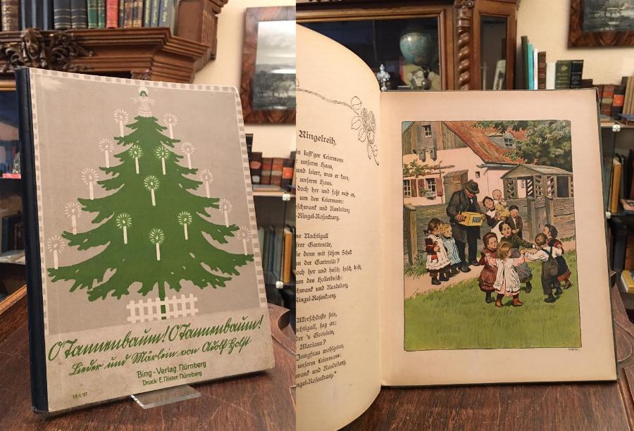Holst, Adolf: O Tannenbaum! O Tannenbaum! : Lieder und Märlein in Auswahl. Mit farbigen Bildern von Paul Hey und [Maximilian] Liebenwein. Nürnberg, Bing-Verlag / Nister, E. (Druck), (1927). 4° (28x22), [32] S., mit 19 Illustrationen und Initialen im Text, sowie 8 farb Tafeln, ill OHln, minimal angeschmuttz, Ecken etwas bestossen, 1 Blatt angerändert, nur vereinzelt minimal fleckig, gutes Exemplar,