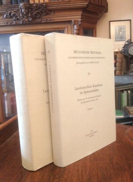 Silagi, Gabriel (Hrsg): Landesherrliche Kanzleien im Spätmittelalter : Referate zum VI. Internationalen Kongress für Diplomatik, München 1983. 2 Teilbände (so komplett), München, Arbeo-Gesellschaft, 1984. 8° (21x15), IX,454; IX,455-765 S., mit 29 teils gefalteten Tafeln, einheitl Oln mit OU, Teilband 1 etwas gebräunt, sonst fest sauber und gepflegt, [= Münchener Beiträge zur Mediävistik und Renaissance-Forschung; 35 : herausgegeben von Gabriel Silagi],