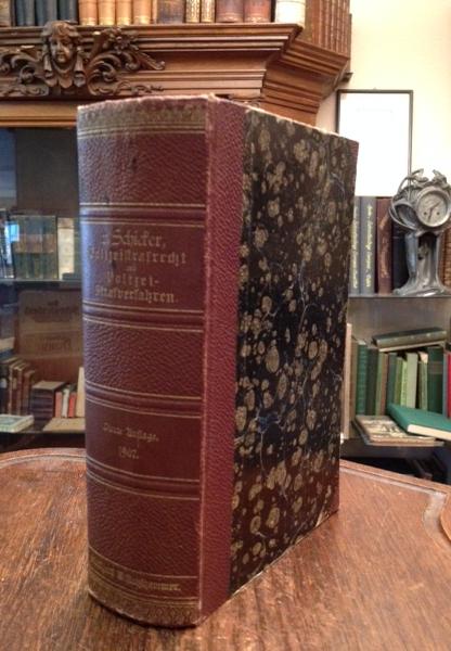 Schicker, [Karl] von: Das Polizeistrafrecht und Polizeistrafverfahren im Königreich Württemberg. 4. Aufl., Stuttgart, Verlag von W. Kohlhammer, 1907. 8° (20x13), XVI, 1000 S., marmor OHln mit goldRTitel, etwas berieben, 2 S. etwas fleckig, gelegentliche kleine Markierung, gutes Exemplar, Das Württembergische Wassergesetz regelte ab 1900 erstmals einheitlich und umfassend die Rechtverhältnisse der Gewässer und der Wasserbenützung und löste teils Jahrhunderte alte Regelungen ab.— ‚Zur Einleitung überriechender, eckelhafter oder schädlicher Flüssigkeiten in ein öffentliches Gewässer ist polizeiliche Erlaubnis erforderlich.‘ (Art.23, 1)