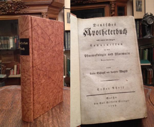 Schlegel, Doctor [Johann Christian Traugott] / Wiegleb, Apotheker [Johann Christian]: Deutsches Apothekerbuch : Erster Theil (Von den rohen und einfachen Arzneymitteln, oder deer pharmaceutischen Materie) : nach neuern und richtigern Kenntnissen in der Pharmakologie und Pharmacie bearbeitet. nur Band 1 von 2, Gotha, Carl Wilhelm Ettinger / Waldenburg, Witsch (Druck), 1793. 8° (20x12), XXVII, 322 S., 1 Bl., neuer Pbd im Stil der Zeit mit gepräg RSchild, alter FarbSchnitt erhalten, gelegentlicher kleiner Eckknick, fest sauber und gepflegt, [VD18 90229908.– Hirsch/Hübotter V, 81].-J.C.T. Schlegel (1746-1824) promovierte 1771 in Jena.– ab 1788 Leibmedicus des Fürsten von Schönburg-Waldenburg.– mehrere medizinische Veröffentlichungen.—