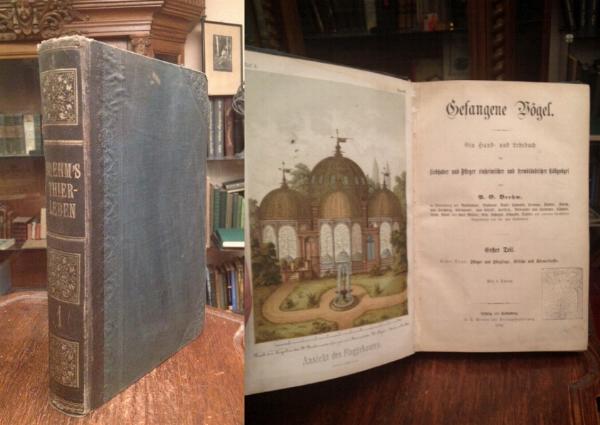 Brehm, [Alfred Edmund]: Gefangene Vögel : Ein Hand- und Lehrbuch für Liebhaber und Pfleger einheimischer und fremdländischer Käfigvögel. Erster Teil. : Erster Band: Pfleger und Pfleglinge, Sittiche und Körnerfresser. Band 1 von 2, Leipzig und Heidelberg, C. F. Winter’sche Verlagshandlung, 1872. 4° (26x17), VIII, 626 S., 1 Bl., mit 4 (1 farb) lith Tafeln, geprägter OHln mit goldRTitel, Einband schwach fleckig, Ecken bestossen, Jugendstil-ExlibrisStempel auf Titelblatt, die Tafeln gering fingerfleckig, gutes solides Exemplar, Rückentitel: Brehm’s Tierleben 1
