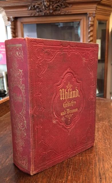 Uhland, Ludwig (1787-1862). – Holland, Wilhelm Ludwig (Hrsg): Uhland : Gedichte und Dramen : Volksausgabe. 3 Teile in 1 Band, Stuttgart, Verlag der J.G. Cotta’schen Buchhandlung, 1863. kl8° (16x11), XIV, 277, VIII, 403, (VII), 259 S., roter Oln mit Blind- und goldPrägung, Einband angeschmutzt, alter durchschlagender Name auf Vorsatz, Papier teils stockfleckig, gutes festes Exemplar,