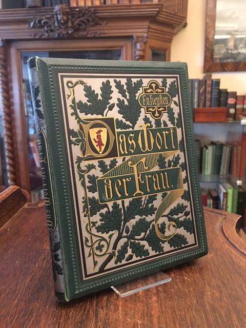 Heyden, Friedrich von: Das Wort der Frau : Eine Festgabe. Mit 20 Illustrationen nach Zeichnungen vom Historienmaler A. von Heyden in Berlin, in Holzschnitt ausgeführt von Kaeseberg & Oertels Xylographischen Institut in Leipzig. 23. Aufl., Leipzig, Friedrich Brandstetter, 1882. 8° (20x15), VIII, 175 S., grüner Oln gewachst mit reicher Prägung, goltTitel, dreiseitiger goldSchnitt, SchmuckVorsätze, nahezu ungelesen, schönes gepflegtes Exemplar,