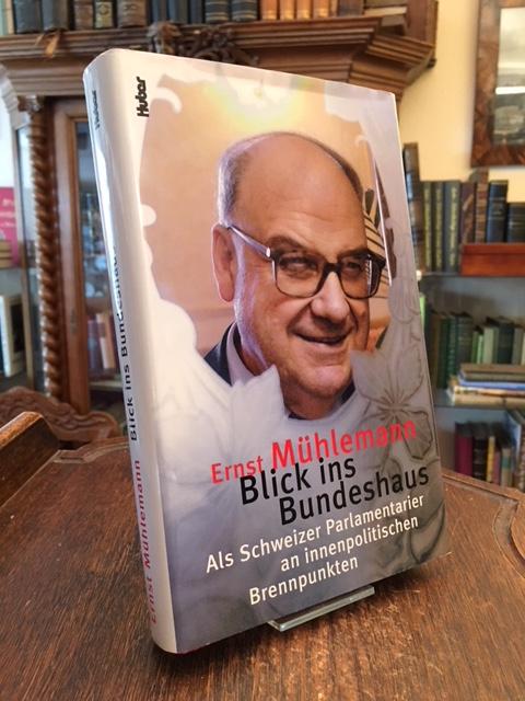Mühlemann, Ernst: Blick ins Bundeshaus : Als Schweizer Parlamentarier an innenpolitischen Brennpunkten. Frauenfeld; Stuttgart; Wien, Verlag Huber, 2005. 8° (23x14), 364 S., mit zahlr. dokumentarischen Aufnahmen, OPbd mit fotoill OU, Schnitt minimal angestaubt, nahezu ungelesen, schönes gepflegtes Exemplar, auf Titelblatt mit handschriftlicher Widmung signiert vom Autor ‚Der stilsicheren Journalistin / [Name] gewidmet / 22.9.05 Ernst Mühlemann‘.–