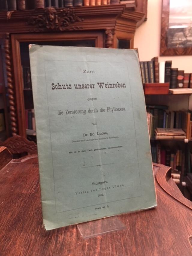 Lucas, [Eduard]: Zum Schutz unserer Weinreben gegen die Zerstörung durch die Phylloxera. Stuttgart, Verlag von Eugen Ulmer, 1882. 8° (20x15), 20 S., 3 Bl., mit 10 Holzschnitten, OKart (Brosch), mit Bleistiftanstreichungen, [= Schoene, Bibliographie zur Geschichte und Kultur des Weines (Schoene3); 5039]