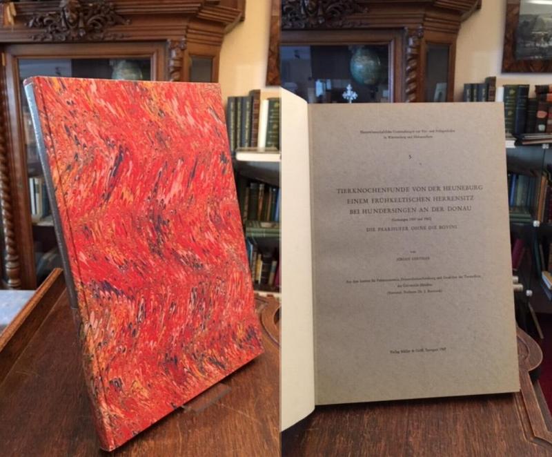 Geringer, Jürgen: Tierknochenfunde von der Heuneburg, einem frühkeltischen Herrensitz bei Hundersingen an der Donau (Grabungen 1959 und 1963) : Die Paarhufer ohne die Bovini. Stuttgart, Verlag Müller und Gräff, 1967. 4° (30x21), V, 88 S., mit Abb. auf 6 Tafel, 2 gefaltete Tab., marmor Pbd mit goldgepräg LdrRSchild, Originalumschläge mit eingebunden, Exlibris auf Vorsatz (Bibliotheca Tiliana), Tilianastempel verso Titel, ohne Gebrauchsspuren, offensichtlich ungelesen, [= Naturwissenschaftliche Untersuchungen zur Vor- und Frühgeschichte in Württemberg und Hohenzollern; 5],