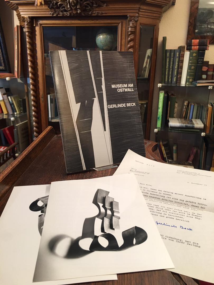 Beck, Gerlinde (1930-2006). – Götz, Marianne / Heydecker, Charlotte (Foto): Gerlinde Beck. Museum am Ostwall, Dortmund, 2. Oktober bis 27. November 1977. Dortmund, Museum am Ostwall / Willy Größchen (Druck), 1977. 4° (27x21), [92] S., mit 113 WerkAbb., ill OKart (Brosch), minimal angestaubt, sauber und wohlerhalten, nummeriertes Freiexemplar 800.– beiliegend SIGNIERTER typographischer Begleitbrief zur Übersendung des Kataloges von Gerlinde Beck an Winfried Wild, Leutkirch, mit 2 Originalfotografien von Stahlskulpturen der Künstlerin (rückseitig Fotografenstempel Marianne Götz), da der Druck des Katalogs ihrer Meinung nach zu wünschen übrig läßt.–