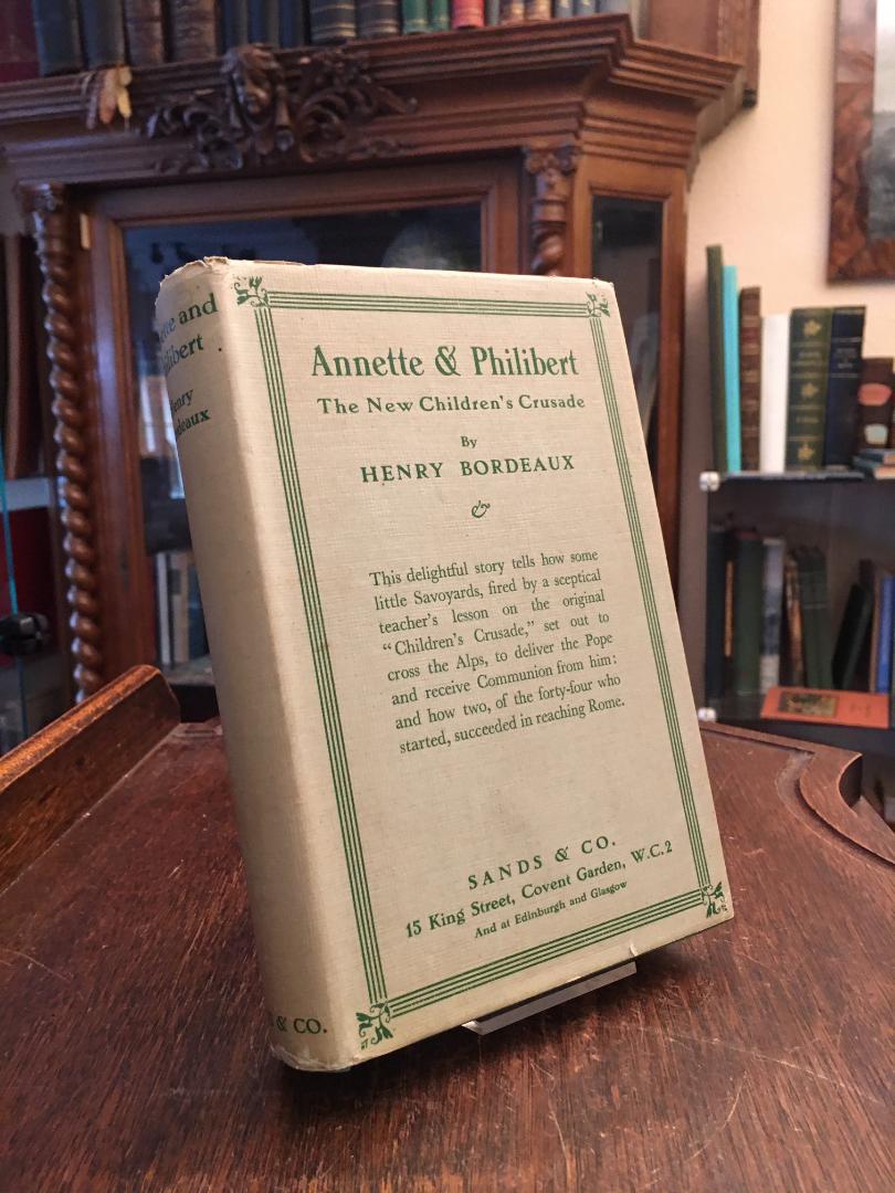 Bordeaux, Henry: Annette and Philibert : The New Children’s Crusade. Translated from the French by the Benedictines of Teignmouth. London, Sands & Co, 1931. 8° (19x13), xxiv, 246 p., with illustrations by M.W. Taylor, publisher’s hardbound green cloth with jacket, owner mark on first endpaper, sl shop soiled, tight and clean,