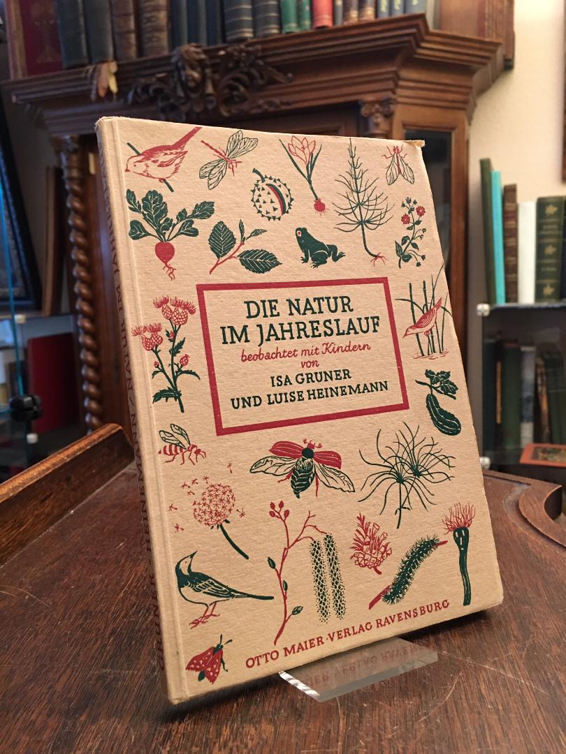 Gruner, Isa / Heinemann, Luise: Die Natur im Jahreslauf beobachtet mit Kindern. 2. Aufl., Ravensburg, Otto Maier Verlag, 1945. 8° (22x15), 144 S., mit zahlr. Illustrationen, zweifarb ill OKart (Brosch), rückseitig und Innenspiegel etwas angestaubt, gutes Exemplar, Die Naturkundliche Bilder zeichnete Esther Bartning, die Bastelzeichnungen Bodo Meyner nach Vorlagen und Anregungen von Luise Heinemann, den Umschlag zeichnete Susanne Ehmcke.— monatliche Beobachtungen in der Pflanzenwelt, Tierwelt und der unbelebten Natur, mit Bastelanregungen.–