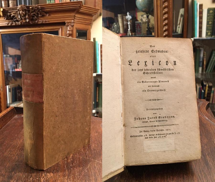 Gradmann, Johann Jacob (evangel. Pfarrer in Ravensburg) (Hrsg): Das gelehrte Schwaben: oder Lexicon der jetzt schwäbischen Schriftsteller voraus ein Geburtstags-Almanach und hintennach ein Ortsverzeichniss. [Ravensburg], Im Verlag bey’m Verfasser, 1802. 8° (22x13), [8] Bl., XXIV, 872, 30 S., späterer Pbd mit goldgepräg RSchild, zweiseitig unbeschnitten, vereinzelte Marginalien mit Bleistift, gutes Exemplar, [Heyd I, 3172].–