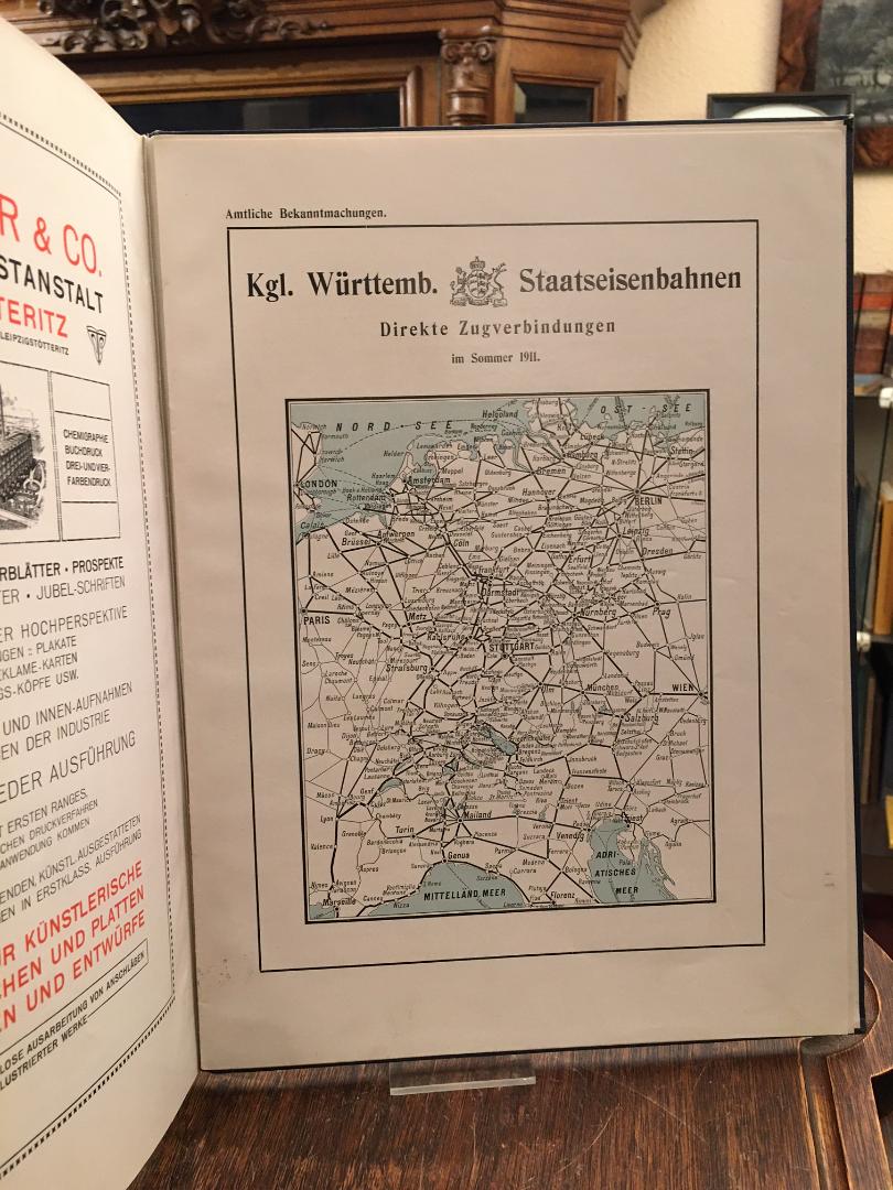 Reise-Album der Königl. Württembergischen Staatseisenbahnen. (Berlin), (Pozsonyi & Berger : Expedition: Stuttgart, A. Bonz Erben) Juni 1911. 4° (32x23), 2 Bl., (Vorwort, Inhalt), 85, (2) Beschriebender Teil mit zahlr. fotograf Aufnahmen, 11 S. (Fahrpläne), + 1 doppelseitige Eisenbahnkarte, blau Oln gewachst mit goldTitel, rückseitig montierte farb Leibniz-Werbung (Claus Meyer), Innenspiegel mit Kleberest/Abrieb, erstes Blatt angelockert, sonst nahezu ungenutzt, schönes gepflegtes Exemplar, [= Reise-Album der Königl. Württembergischen Staatseisenbahnen; 2] Das Reisealbum liegt während des ganzen Jahres in den Abteilen der ersten, zweiten und dritten Wagenklasse der Schnellzüge, Eilzüge und Personen-Fernzüge, in den Bahnhöfen, in den Wartesälen und Restaurationslokalitäten I. und II. Klasse der Württembergischen Staatsbahnen, in den Lesezimmern erster Ärzte , der hervorragenden Kur- und Badeorte, sowie Sanatorien, ferner in den bedeutendsten Hotels usw. des In- und Auslandes aus. … Vorliegendes Reisealbum ist dazu berufen, den Fremdenverkehr in den an landschaftlichen Reisen so reichen Königreich Württemberg fördern zu helfen und durch seine geschäftlichen Ankündigungen der reisenden Welt als ein verläßliches Nachschlagebuch zu dienen. (Verlag)