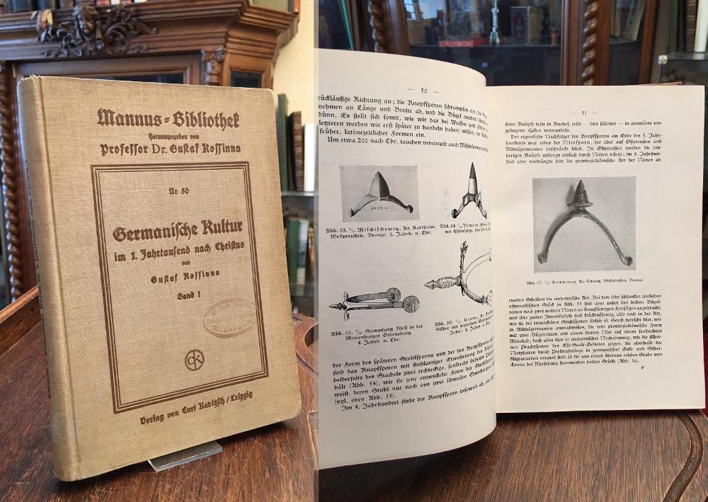 Kossinna, Gustaf: Germanische Kultur im 1. Jahrtausend nach Christus : Band 1 [alles Erschienene]. Leipzig, Verlag von Curt Kabitzsch 1932. 4° (25x18), XII, 367 S., mit 422 Abb., 1 gefaltete Karte, Oln mit TitelPrägung, dreisieitiger Rotschnitt, etwas angestaubt, Schulstempel auf Deckel/Vorsatz/Titel, Inhaltsverzeichnis sowie sehr vereinzelte Buntstiftunterstreichungen, ordentliches festes Exemplar, [= Mannus-Bibliothek; 50 : herausgegeben von Gustaf Kossinna],