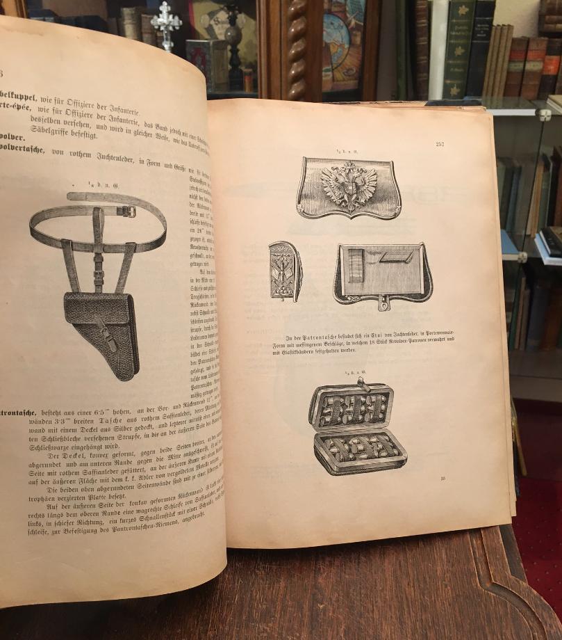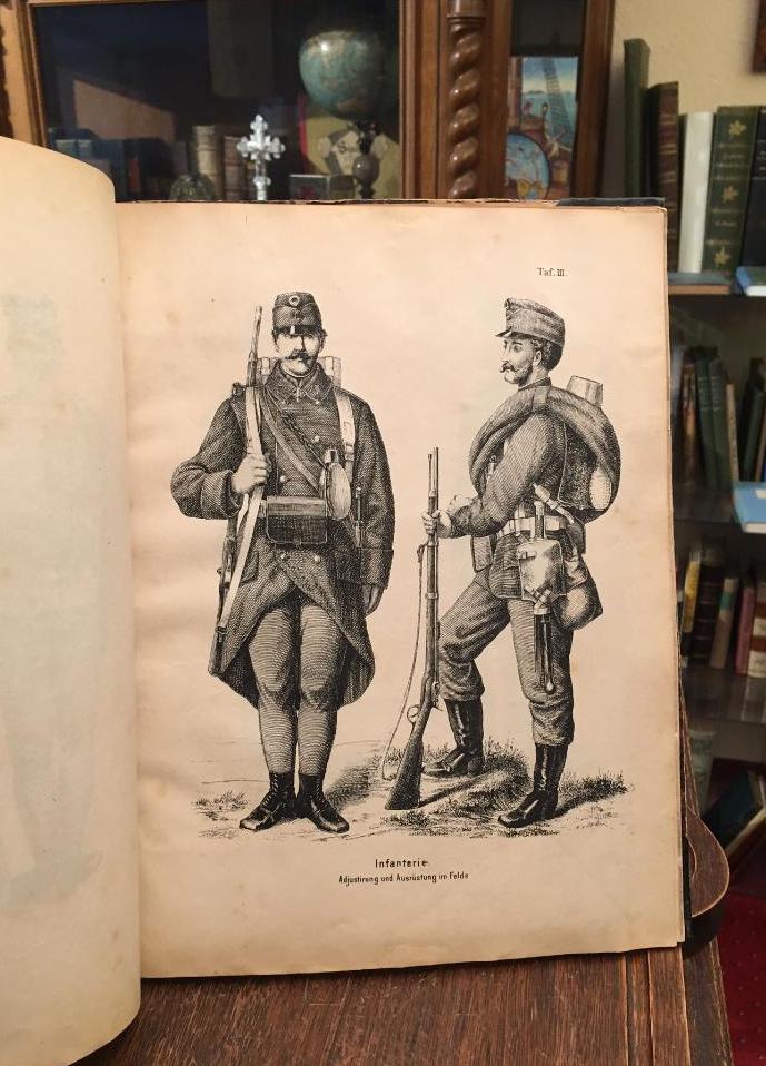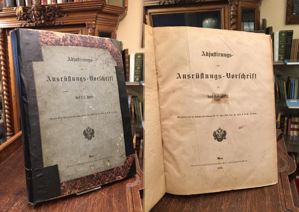 Adjustirungs und Ausrüstungs-Vorschrift für das k. k. Heer. (Verlautbart mit der Cirkular-Verordung vom 13. Juni 1878. Präs. Nr. 2635 A. V. Bl., 29. Stück) Wien, Druck der kaiserlich-königlichen Hof- und Staatsdruckerei, 1878. 4° (30x23), VIII, 534 S., 11 Holzstichtafeln, reich illustriert mit Uniformteilen und Ausrüstungegegenständen / + 56 Bl. Anhang (Berichtigungen zu A. – 28 (Adjustirungs- und Ausrüstungs- Vorschrift für das k. k. Heer), u.a. Zusätze, marmor Hln d.Zt. mit mont Deckeltitel, Rücken/Ecken alt mit Klebeband verstärkt, die ersten Blatt mit kleinem reparierten durchgehenden Löchlein, anfangs etwas gelockert, insgesamt gebrauchtes aber ordentliches vollständiges Exemplar,
