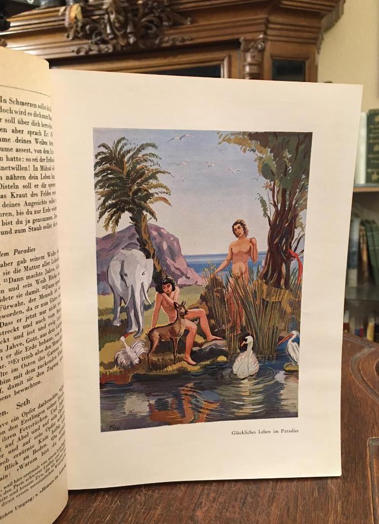 Bibel. – AT. – NT. – Schwegler OSB, Theodor (ÜB) / Herzog, Franz Alfred / Perk, Johann (Hrsg): Katholische Familien-Bibel : Die Heilige Schrift des Alten und des Neuen Testamentes in ungekürzter Fassung mit Erläuterungen. mit 50 ganzseitigen Illustrationen, 16 farb Kunstdruckbeilagen und 5 Landkarten. Zürich u.a., Stauffacher-Verlag, (1957). 4° (26x19), 1944 S., roter Oln gewachst mit goldPrägung, Rücken etwas lichtverfärbt, kaum genutzt, gutes gepflegtes Exemplar, (Familienbibel).— Das Alte Testament übersetzt und erklärt von Theodor Schwegler OSB, Kapitular des Stiftes Maria-Einsiedeln, mit Beiträgen von F.A. Herzog, nach dem Grundtext bearbeitet von Herbert Haag.– Das Neue Testament übersetzt und erläutert von Johann Perk, Salesianerpriester.– Die Illustrationen von Fred Fay und Tildy Grob.–