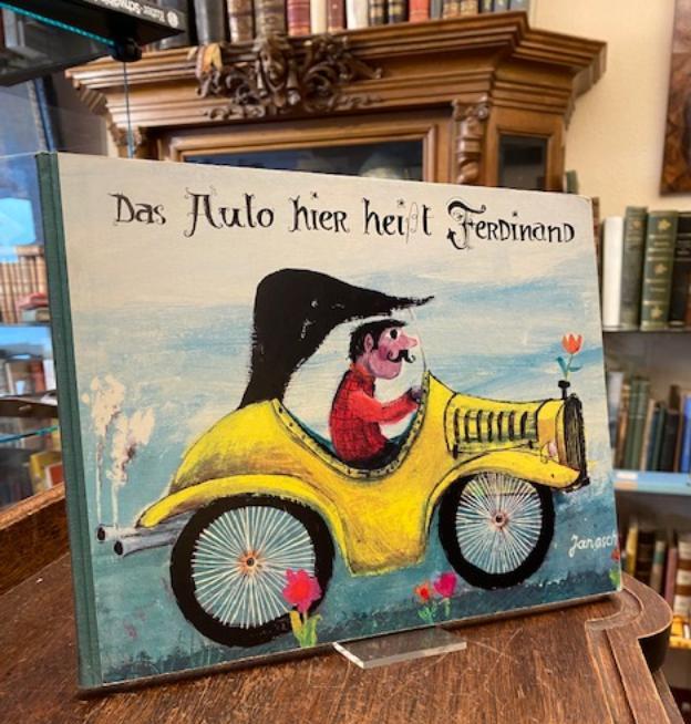 Janosch [d.i. Horst Eckert]: Das Auto hier heisst Ferdinand. (Lizenzausgabe mit Genehmigung des Parabel Verlag, München), Stuttgart, Deutscher Bücherbund / München, Poerschke & Weiner (Druck), [1970]. 4°quer (21x27), [6] Bl. Hartkarton, mit 5 doppelseitigen farb Illustrationen + beidseitiger Einbandillustration, beidseitig ill HartBrosch mit grünem LeinenRücken, 2 Ecken leicht gestaucht, sonst nahezu ungelesen, schönes gepflegtes Exemplar,