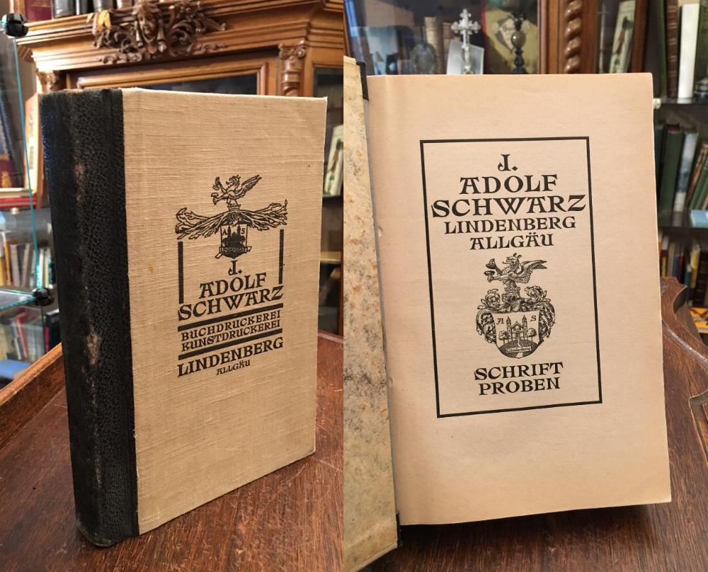 Schwarz, Adolf J., Lindenberg Allgäu. [Musterbuch] Schriftproben : J. Adolf Schwarz, Lindenberg Allgäu. Lindenberg, Buch- und Kunstdruckerei Adolf Schwarz, [ab etwa 1920]. 4° (25x17), ca. 300 S., bedruckte Klemm Mappe mit Lederrücken, gering berieben, Schnitt etwas begriffen, gutes gepflegtes Exemplar, Musterbuch der Druckerei Schwarz in Lindenberg, enthält die erhältlichen Antiqua- und Fraktur-Schriften, sowie einige Spezialschriften (Schreibschrift/Kurrent) und Zierwerk (Initialen, Einfassungen, Vignetten).— J. Adolf Schwarz gründete im Jahr 1899 eine Buch- und Kunstdruckerei in Lindenberg. Mit künstlerisch und drucktechnisch herausragenden Notgeld-Drucken machte er in den Jahren 1917 bis 1923 Lindenberg als ‚Geldstadt‘ deutschlandweit bekannt.