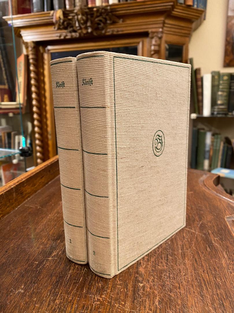 Kleist, Heinrich von (1777-1811). – Minde-Pouet, Georg (Hrsg/Bearb/Biograph Einleitung): Heinrich von Kleist [Werke in zwei Bänden / Auswahl]. 2 Bände in 2 [so komplett], Leipzig, Bibliographisches Institut, 1935. 8° (19x12), 539; 443 S., (in getrennter Zählung), heller Oln mit grüner Prägung, nahezu ungelesen, schönes gepflegtes Exemplar, [= Deutsche Kulturbücherei; 9 / 10 : herausgegeben von Martin Löpelmann], [Sarkowski BI 33 c 47].– (Die Deutsche Kulturbücherei ist eine Serie von Auswahlklassikern, die 1935 in 15 Bänden erschien und von Martin Löpelmann herausgegeben wurde).— BAND 1: Geleitwort.– Kleists Leben.– Die Hermannschlacht.– Prinz Friedrich von Homburg.– Das Käthchen von Heilbronn.— BAND 2: Der zerbroche Krug.– Michael Kohlhaas.– Das Erdbeben von Chile.– Das Bettelweib von Locarno.– Der Zweikampf.– Penthesilea.–