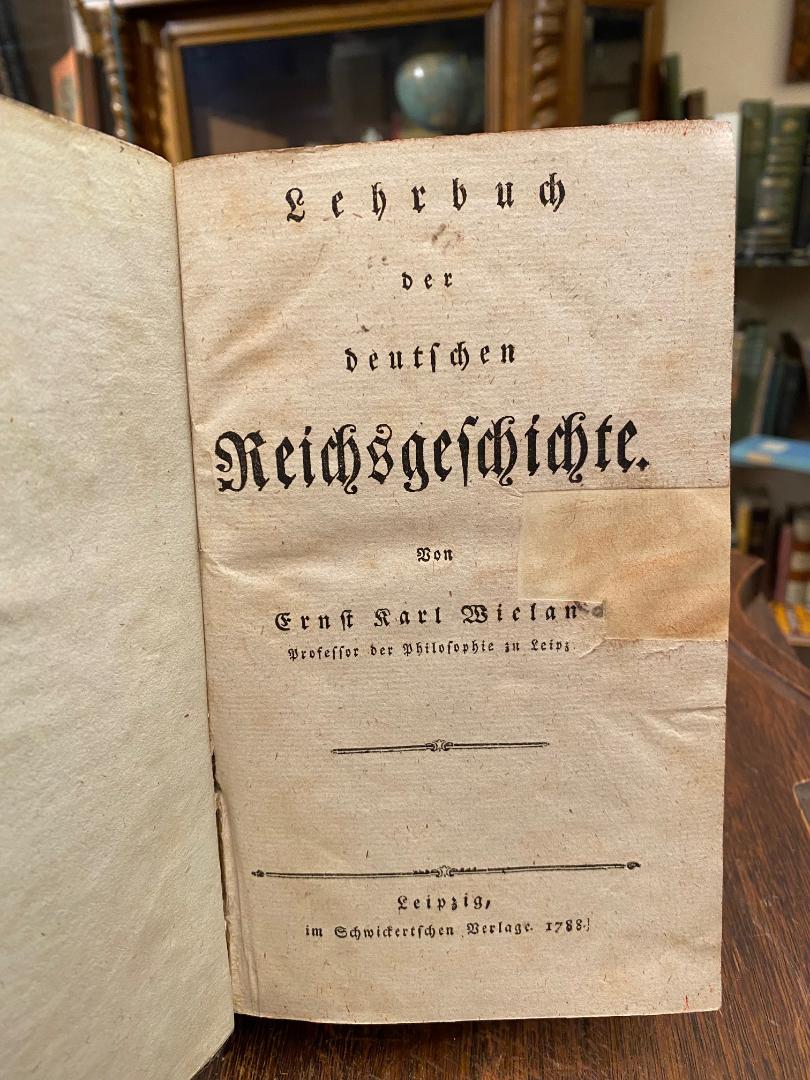 Wieland, Ernst Karl (1755-1828 : Professor der Philosophie zu Leipzig): Lehrbuch der deutschen Reichsgeschichte. Leipzig, im Schickert’schen Verlage, 1788. 8° (20x22), XVI, 430 S., durchgehend mit zusätzlichen Leerblättern, die etwa zur Hälfte in zeitgenössischer dekorativer Handschrift beschrieben sind, Pbd d. Zt., Einbandbezug stark abberieben, Titelblatt mit alt unterlegtem Ausschnitt, guter fester Block, [VD18 11629142]