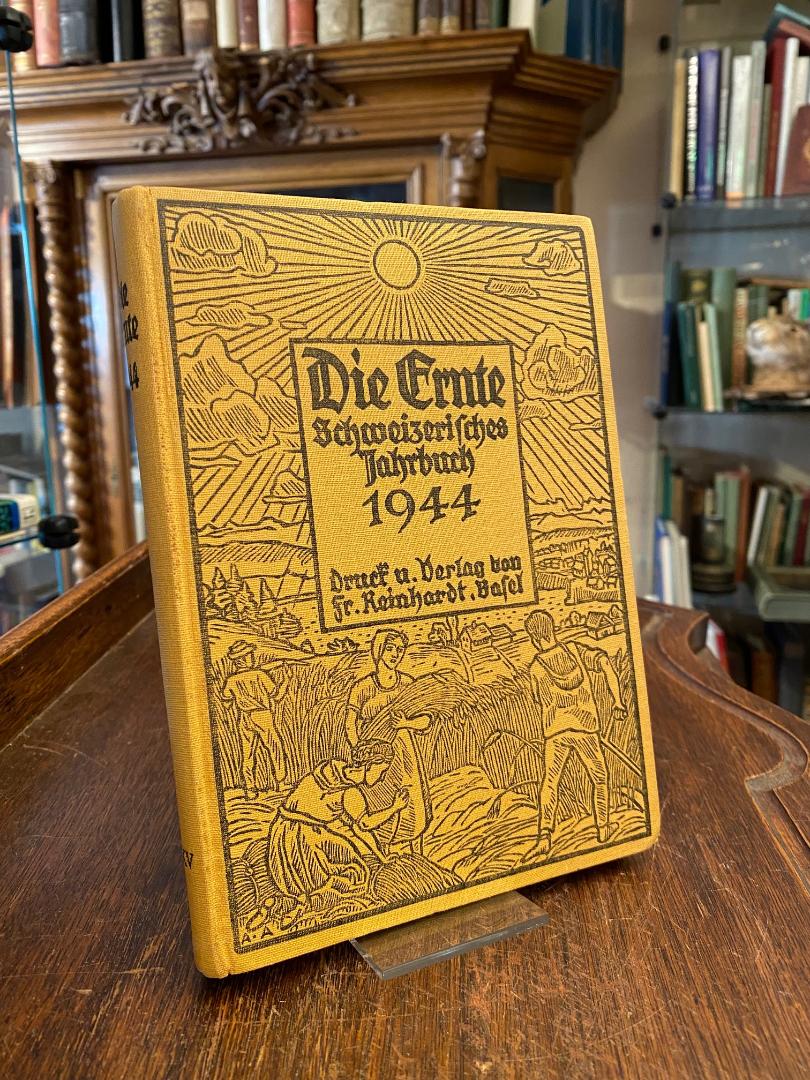 Garbe-Schriftleitung (Hrsg): Die Ernte : Schweizerisches Jahrbuch 1944 : 25. Jahrgang. Basel, Verlag von Friedrich Reinhardt, (1943). 8° (20x14), 188 S., mit zahlr. Textillustrationen und teils farb Tafeln, einige Werbeblätter, gelber Oln mit geprägter Illustration, SchmuckVorsätze, nahezu ungelesen, schönes gepflegtes Exemplar,