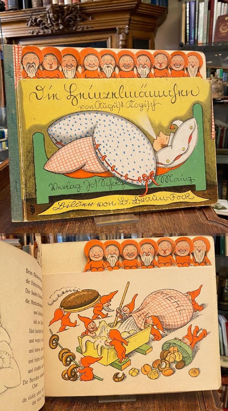 Kopisch, August (Text) / Braun-Fock, [Beatrice] (Ill): Die Heinzelmännchen. Mainz, Verlag Jos. Scholz, [wohl 1946]. 4°quer (21,5x27), 10 Bll., vorderseitig farb lith Illustrationen, rückseitig s/w Illustrationen mit begleitenden Versen in Antiqua, ill OHartBrosch mit Leinenrücken, oben Handregister mit ausgestanzten Wichtel-Köpfen, obere Ecke mit minimaler Fehlstelle, nahezu ungelesen, schönes gepflegtes Exemplar, sauber und frisch, [= Verlags-Nr. 428], [Doderer, Lex. KJL I, S. 199f.– Schug, Bilderwelt; 724 für Ausgabe 1937].– Wie war zu Köln es doch vordem / mit Heinzelmännchen so bequem! / …