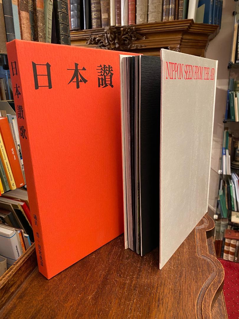 ISOGAI Hiroshi / TAMIYA Torahiko: Nippon seen from the Air. Tokyo, Nippon Airways : Toppan (impr), 1979. 4° (37x26), 232 p., with 100 full page photos, double page map with locations, publisher’s hardbound in slipcase, private dedication, tight and clean, well cared, text in Japanese, captions bilingual Japanese – English.–