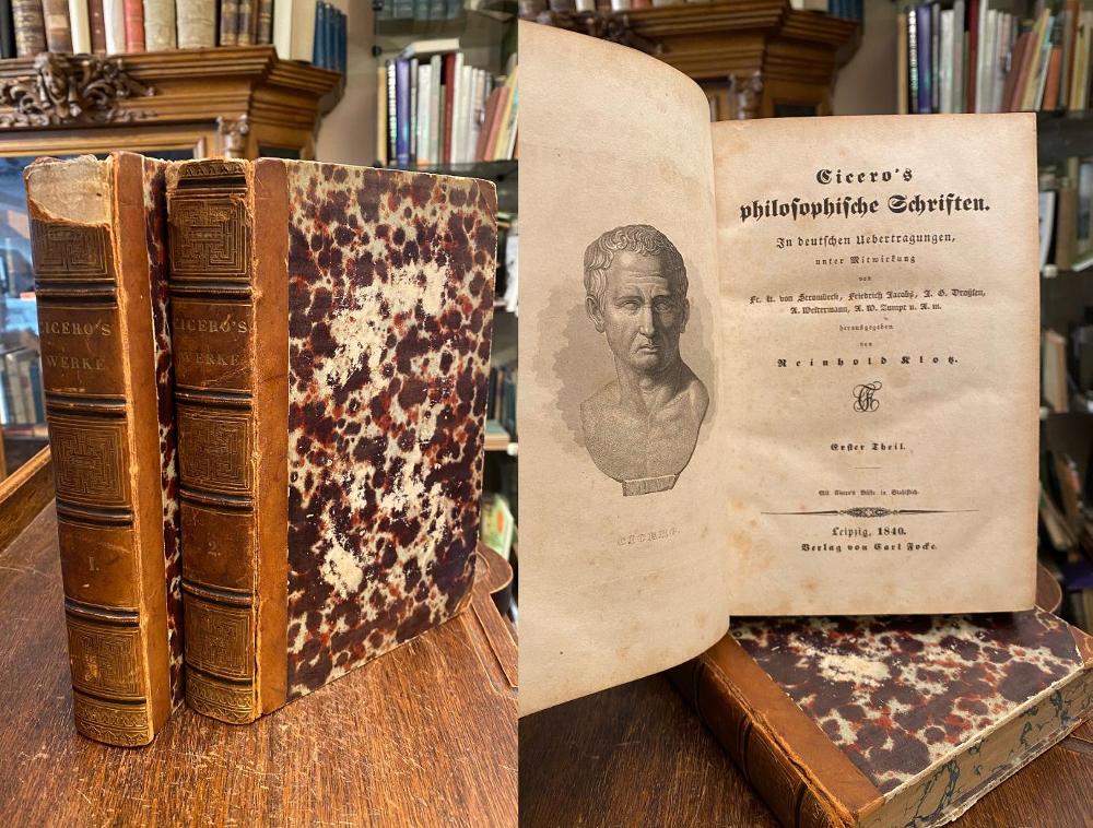 Cicero, Marcus Tullius (106v-43v). – Klotz, Reinhold (Hrsg): Cicero’s philosophische Schriften: Erster [und] Zweiter Theil [so komplett]. In deutschen Übertragungen unter Mitwirkung von Fr. K. von Strombeck, Friedrich Jakobs, J. G. Droysen, A. Westermann, A. W. Zumpt u. A. m. herausgegeben von Reinhold Klotz. 2 Bände in 2 (alles Erschienene), Leipzig, Verlag von Carl Focke, 1840-1841. 8° (23x16), XII, 676; (V), 710 S., mit Frontispiz (Ciceros Büste in Stahlstich), einheitl Hldr d.Zt. (HFrz), reiche goldRPrägung, marmorVorsätze, Rücken kopfseitig mit Fehlstelle, Ecken/Kanten bestossen, Papier leicht gebräunt, gute solide Exemplare, [= Cicero’s sämmtliche Werke in deutschen Übertragungen; 1-2],