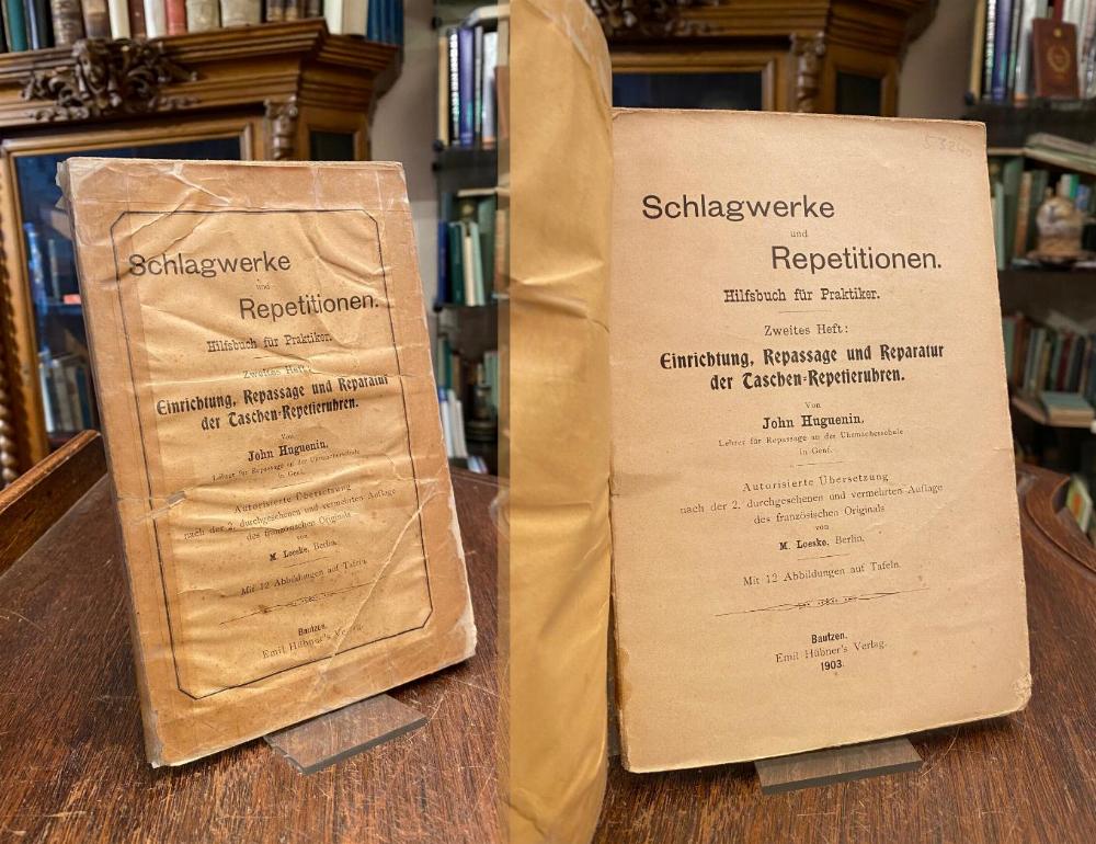 Huguenin, John: Schlagwerke und Repetitionen : Hilfsbuch für Praktiker : Zweites Heft: Einrichtung, Repassage und Reparatur der Taschen-Repetieruhren. Autorisierte Übersetzung nach der 2., durchgesehenen und vermehrten Auflage des französischen Originals von M. Loeske, Berlin. Bautzen, Emil Hübner’s Verlag, 1903. 8° (20x14), 73 S., 4 Bl., mit 12 Abb. auf 12 Autotypie-Tafeln, OKart (Brosch), Umschlag knittrig und alt säurefrei unterlegt, sonst gutes sauberes Exemplar, John Huguenin: Lehrer für Repassage an der Uhrmacherschule in Genf.–
