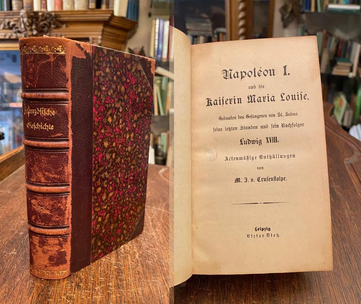 Crusenstolpe, [Magnus Jakob] von: Napoleon I. und die Kaiserin Maria Louise : Gedanken des Gefangenen von St. Helena, seine letzten Stunden und sein Nachfolger Ludwig XVIII : Actemäßige Enthüllungen. 2 Teile in 1 Band, Leipzig, Victor Dietz, [um 1900]. kl8° (17x10), 353, 354 S., Hldr d.Zt. mit goldRPrägung, dreiseitiger Rotschnitt, SchmuckVorsätze, Leder berieben, Papier teils etwas gebräunt, gutes Exemplar,