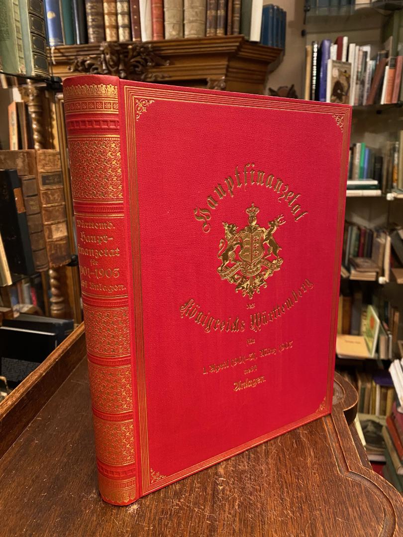 Hauptfinanzetat des Königreichs Württemberg für die Rechnungsjahre 1901 und 1902 nebst Anlagen. Stuttgart, K. Hofbuchdruckerei Zu Guttenberg (Carl Grüninger), ausgegeben im Januar 1901. 4° (30x22), IV, ca. 900 S. getrennt paginiert, roter Oln gewachst mit reicher goldPrägung, dreiseitiger GoldSchnitt, goldSchmuckVorsätze, ohne Gebrauchsspuren, frisch, aus der Bibliothek Schloss Altshausen mit Papiersiegel-Exlibris von Robert Herzog von Württemberg