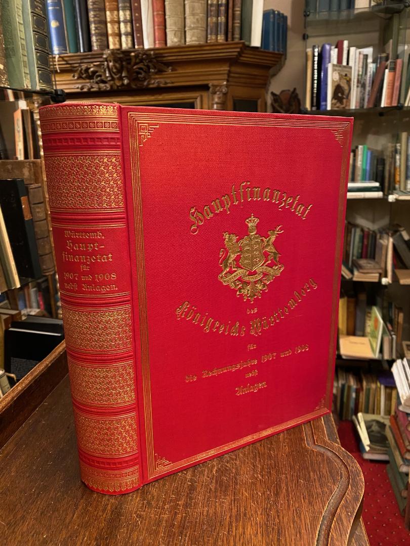 Hauptfinanzetat des Königreichs Württemberg für die Rechnungsjahre 1907 und 1908 nebst Anlagen. Stuttgart, K. Hofbuchdruckerei Zu Guttenberg (Carl Grüninger), ausgegeben im Februar 1907.. 4° (30x22), V, ca. 1200 S. getrennt paginiert, roter Oln gewachst mit reicher goldPrägung, dreiseitiger GoldSchnitt, goldSchmuckVorsätze, ohne Gebrauchsspuren, frisch,