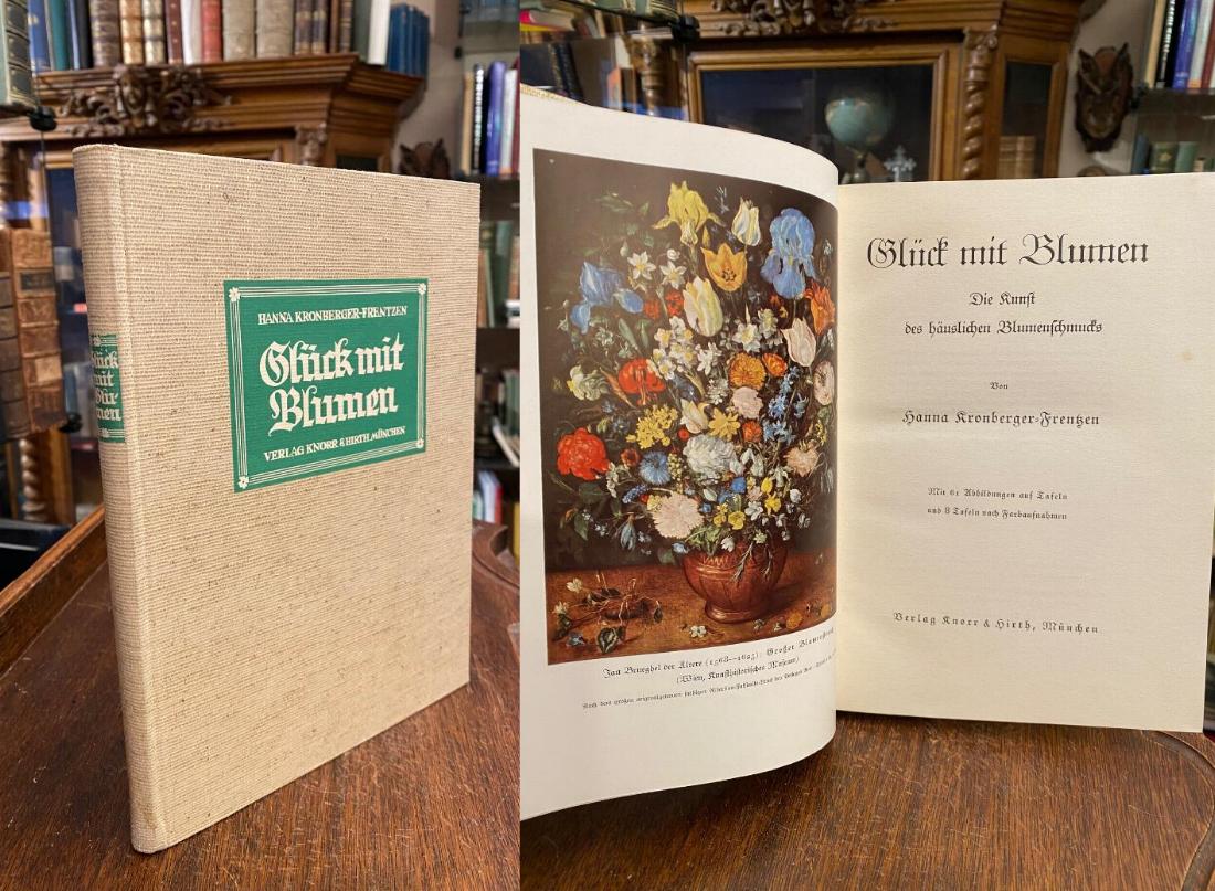 Kronberger-Frentzen, Hanna: Glück mit Blumen : Die Kunst des häuslichen Blumenschmucks. München, Verlag Knorr & Hirt, (1938). 4° (26x19), 127 S., mit 61 Abb. auf Tafeln und 8 Tafeln nach Farbaufnahmen, Oln mit mont Titelschild, Widmung auf Vorsatz, nahezu ungelesen, schönes gepflegtes Exemplar,