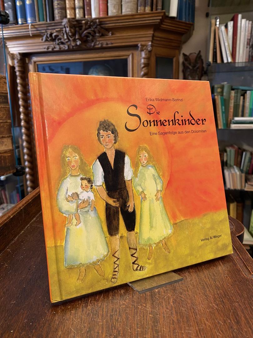 Widmann-Scrinzi, Erika (Text/Ill) / Wolf, Karl Felix (Sammlung): Die Sonnenkinder : Eine Sagentrilogie aus den Dolomiten. Brixen, Verlag A. Weger, (2005). 8° (22x22), 47 S., mit zahlr. farb Illustrationen, farb ill OPbd, kleine Oma-Widmung auf Vorsatz, sonst fest sauber und gepflegt, Die Verfasserin möchte mit vorliegenden Geschichten Lebewesen und Menschen aus der Urgeschichte der Dolomiten wieder aufleben lassen.–