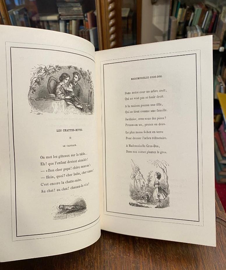 Marelle, Charles: Le Petit Monde : Enfantillage et Poesie : Fabulettes Allemandes – Historiettes – Contes – Moralites. Illustree de 150 vignettes par nos meilleurs artistes. Paris, J. Hetzel, (1863). 8° (23x15), (viii), 192 p., avec 150 gravures sur bois, reliure en demi-cuir bleu fonce de l’epoche, dos dore, dore sur tranches, gardes moiree blanche, titre et quelques pages avec des rousseurs, sinon tres bon, Provenance: bibliotheque ducale de chateau Altshausen.– sur titre avec ex libris Mariae Ducissae [c’est-a-dire Maria Immakulata d’Autriche Duchesse de Wurtemberg (1878-1968)].–