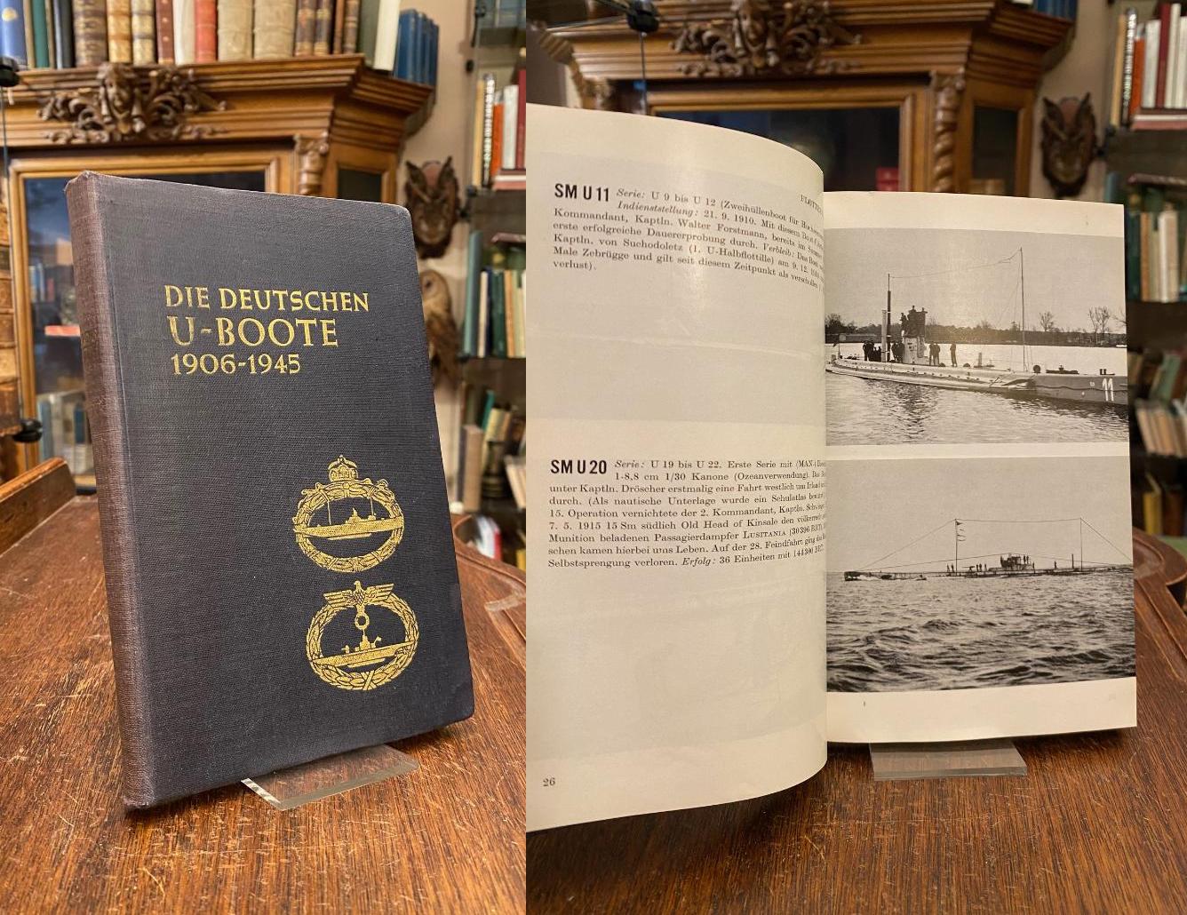 Herzog, Bodo: Die deutschen Uboote 1906 bis 1945. München, J. F. Lehmann’s Verlag, 1959. 8° (20x13), 234 S., 1 Bl., mit 111 Abb., 1 eingefaltete Tab., flex blauer Oln mit goldPrägung, Rücken aufgehellt, etwas berieben, Namensstempel auf Vorsatz, fest und sauber,