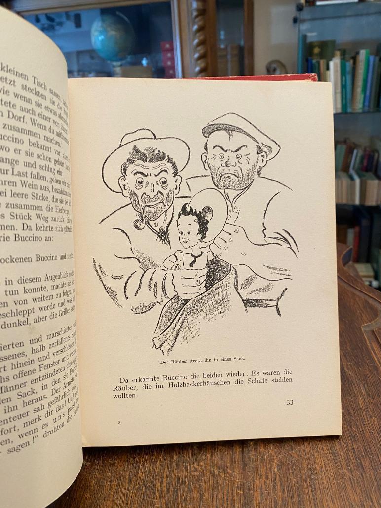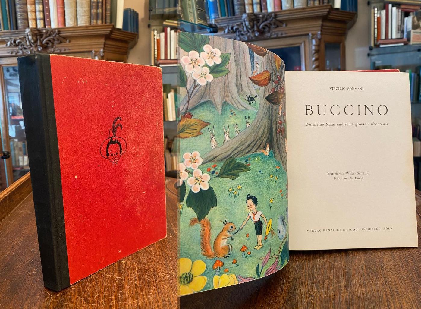 Sommani, Virgilio: Buccino : Der kleine Mann und seine grossen Abenteuer. Deutsch von Walter Schläpfer. Bilder von [Sam] Junod. [1. Aufl.], DEA, Einsiedeln; Köln, Verlag Benziger & Co, 1942. 8° (22x16), 236 S., 2 Bl., mit farb Frontispiz und sehr zahlr. teils ganzseitigen Illustrationen, OPbd mit kleinem Deckelbild, etwas berieben, Rückenleinen erneuert (ohne Prägung), erste und letzte Blätter im schwachem Braunfleck im weissen Rand, sonst fest und sauber, sehr ordentliches Leseexemplar,