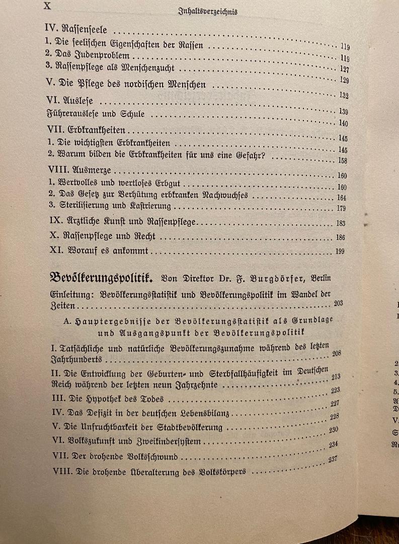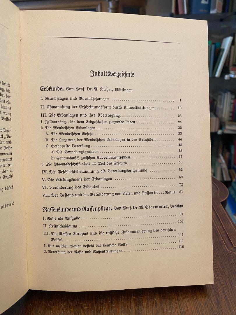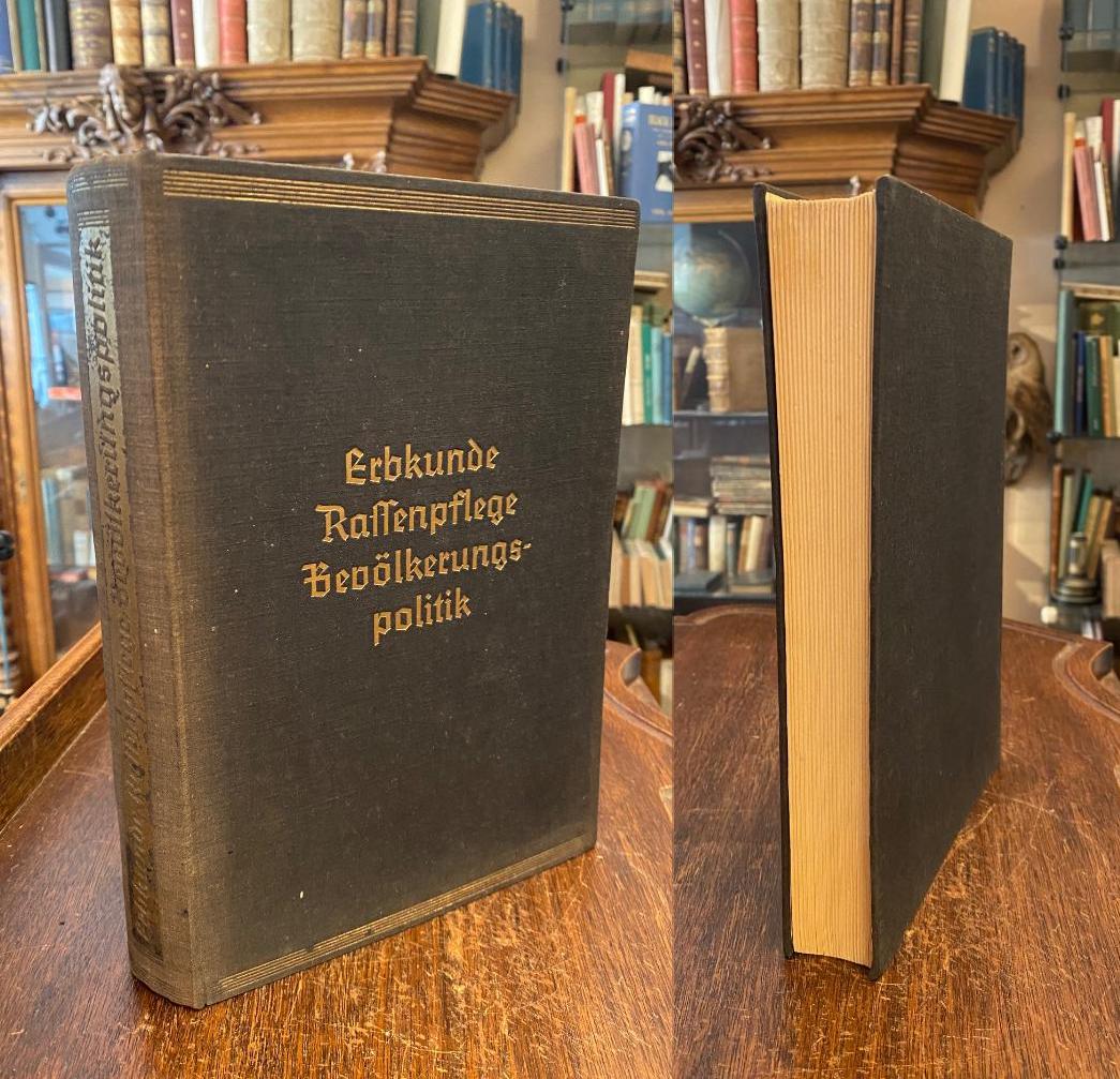 Woltereck, Heinz (Hrsg) / Kühn, Alfred / Staemmler, Martin / Burgdörfer, Friedrich: Erbkunde – Rassenpflege – Bevölkerungspolitik : Schicksalsfragen des deutschen Volkes. 3., verbesserte Aufl., leipzig, Verlag von Quelle & Meyer, 1936. 4° (25x18), XI, 330 S., 1 Bl. Verlagsanzeigen, schwarzer Oln mit goldPrägung, Einband angestaubt und etwas berieben, Name auf Vorsatz, innen sauber und gepflegt,