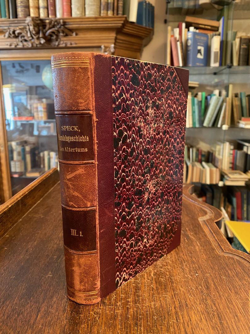 Speck, [Ernst]: Handelsgeschichte des Altertums : Band III, 1. Hälfte: Die Karthager. Die Etrusker. Die Römer bis zur Einigung Italiens 265 v. Chr. Leipzig, Friedrich Brandstetter, 1905. 8° (22x14), VIII, 535 S., Hldr d.Zt. mit goldRTitel, Leder etwas berieben, Namensstempel auf Vorsatz/Titelblatt, sonst fest sauber und gepflegt, [= Speck, Handelsgeschichte des Altertums; III.1],