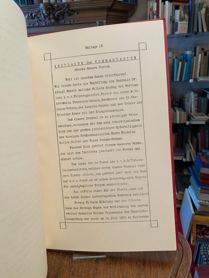 Wilhelm Nicolaus Herzog von Württemberg (1828 Carlsruhe O/S – 1896). – Enthüllungsfeier des Denkmals Seiner königlichen Hoheit weiland Wilhelm Herzog von Württemberg k. u. k. Feldzeugmeister im k. u. k. Offiziersweiseninstitute in Hirtenberg am 27. Juni 1914. Typoskript, 1914. 4° (34x21), [33] Bl., Typoskript, roter Oln mit BlindPrägung und goldTitel, SchmuckVorsätze, schönes gepflegtes Exemplar, enthält eine genaue Beschreibung der Feierlichkeiten, Chorgesänge, Gedichte, Gebet, Ansprachen, sowie eine genaue Beschreibung des Denkmals, das der Industrielle Fridolin Keller, Ritter des Franz Joseph-Ordens, nach den Plänen des Baumeisters Josef Keitzl von der Firma Adolf Baron Pittl in Weißenbach a. d. Triesting hat ausführen lassen.–