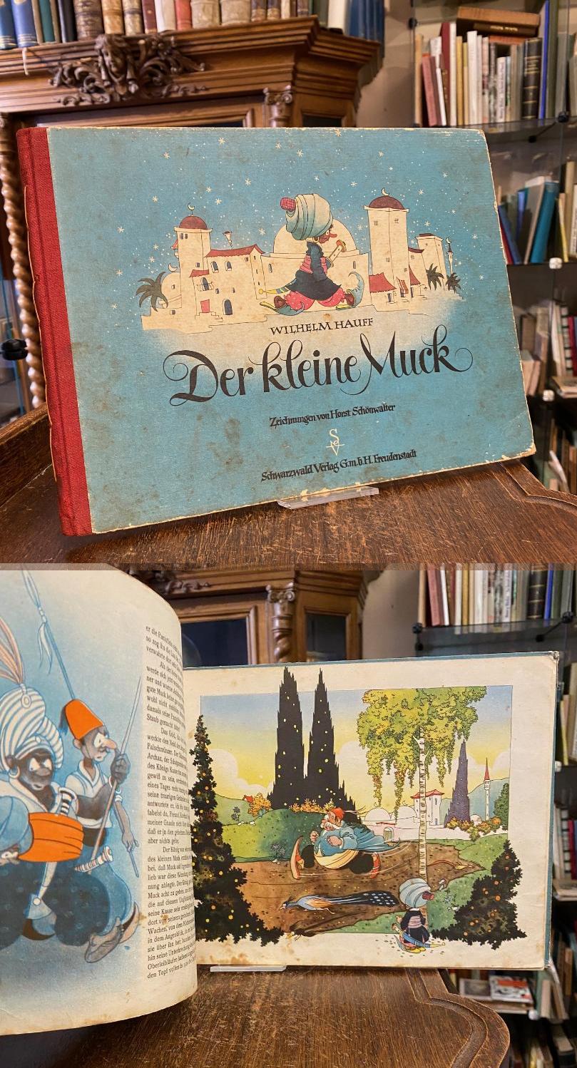 Hauff, Wilhelm (Text) / Schönwalter, Horst (Ill): Der kleine Muck. Freudenstadt, Schwarzwald Verlag, 1949. 4°quer (21x27), [20] S., reich illustriert, ill OHln, Ecken/Kanten bestossen, deutlich angeschmutzt, Fadenbindung erneuert, Papier durchgehend stärker fleckig, Name und Schulstempel auf Titel, trotzdem sammelwürdig und gutes festes Leseexemplar, – Zustand im Preis berücksichtigt – ,
