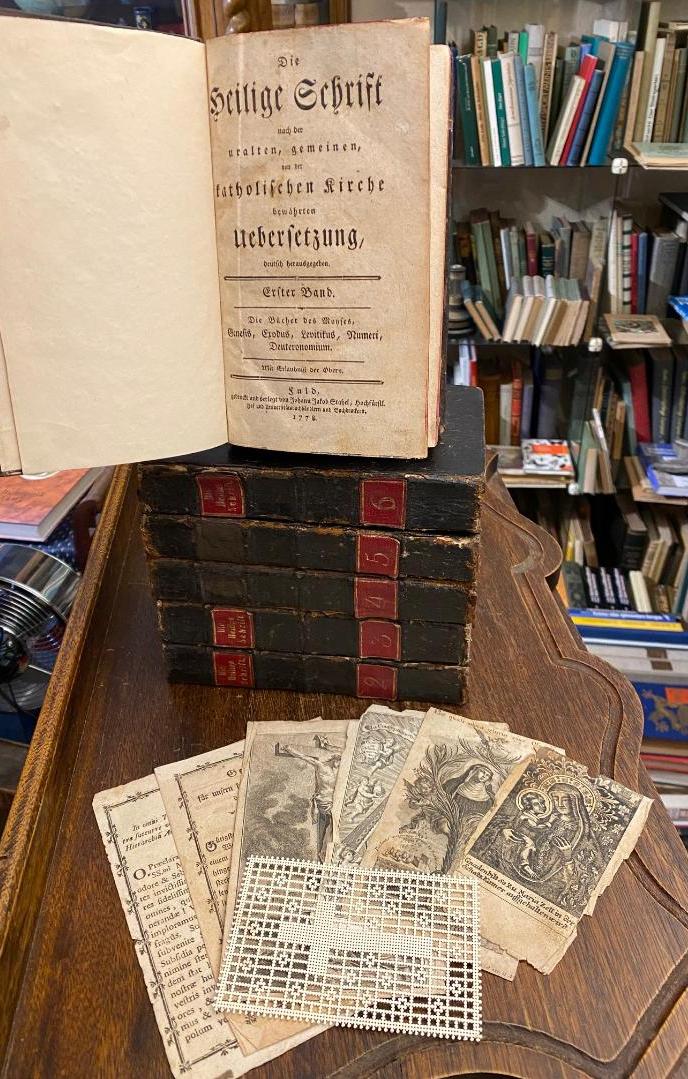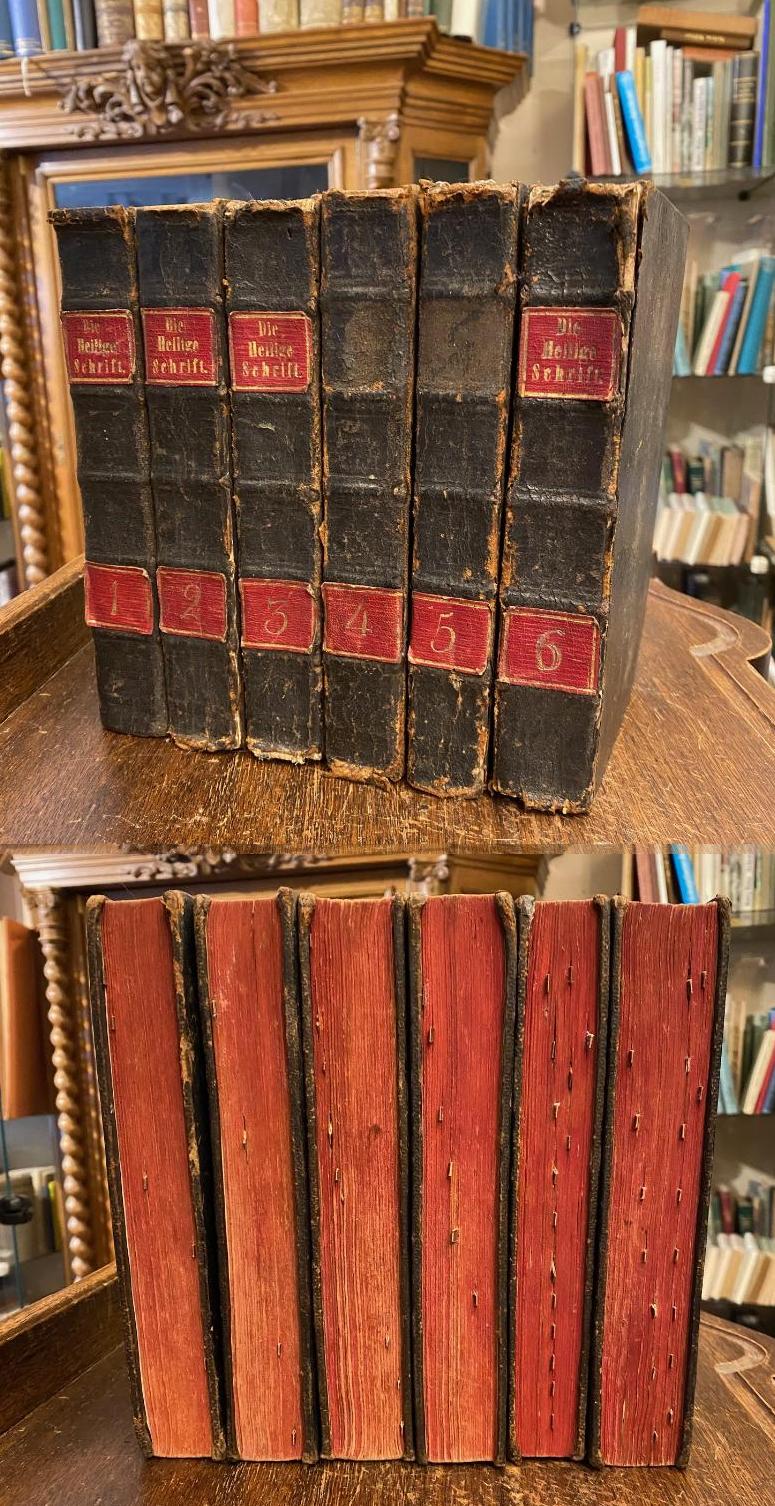 Bibel. – AT. – NT. – Die Heilige Schrift nach der uralten, gemeinen, von der Kirche bewährten Uebersetzung, deutsche herausgegeben [in sechs Bänden]. 1. Aufl., 6 Bände in 6 (so komplett), Fuld [Fulda], gedruckt und verlegt von Johann Jakob Stahel, 1778 – 1781. 8° (19x12), (X), 428; (IV), 506; 426; 404; 366; 566 Ldr d.Zt. mit 2 roten LdrRSchildern, dreiseitiger Rotschnitt, kleine Handregister, Leder etwas berieben, Kapitale teils etwas verletzt, gelegentliches Fleckchen, ordentliche solide Exemplare, BAND I: Die Bücher Moyses, Genesis, Exodus, Levitikus, Numeri, Deuteronomium.– BAND II: Die Bücher Josue, der Richter, Ruth, die vier Bücher der Könige, die zwei Bücher der Chronike.– BAND III: Die Bücher Esdras, Tobias, Judith, Esther, Job, die Psalmen, die Sprüchwörter Salomons, der Prediger, das Hohelied.– BAND IV: Die Bücher der Weisheit, des Jesu Sohnes des Sirach, Isaias, Jeremias, die Klaglieder, Baruch.– BAND V: Die Bücher des Ezechiel, Daniel, Osea, Joel, Amos, Abdias, Jonas, Michäas, Nahum, Habakuk, Sophonias, Haggäus, Zacharias, Malachias und die beiden Bücher der Machabäer.– BAND VI: Das neue Testament unsers Herrn Jesu des Gesalbten.–