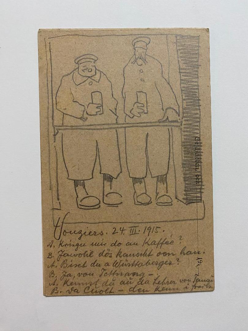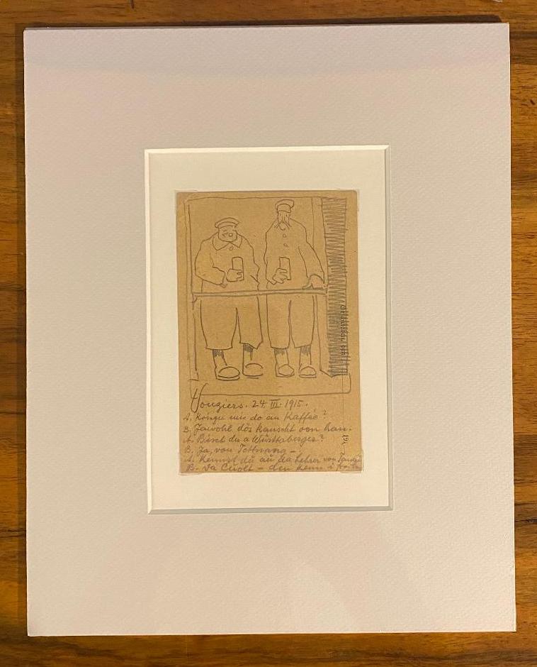 Osswald, Eugen (1879 Stuttgart – 1960 München) Illustrator und Karikaturist: Osswald Eugen : Eigenhändige Feldpost-Ansichtskarte des Künstlers und Soldaten an Carl Cuolt in Tannau bei Tettnang datiert 24.III.1915 : rückseitig mit eigenhändiger Bleistift-Karikatur zweier Soldaten an der Front beim Kaffeetringen. FR-Vouziers, 1915. 12° (14x9), schöner gepflegter Zustand, wir haben die Karte zur sofortigen Rahmung frei in Passepartout gelegt, Osswald arbeitete als Maler, Illustrator (u.a. populärer Kinderbücher) und Karikaturist in München, u.a. als Mitarbeiter bei der JUGEND.–