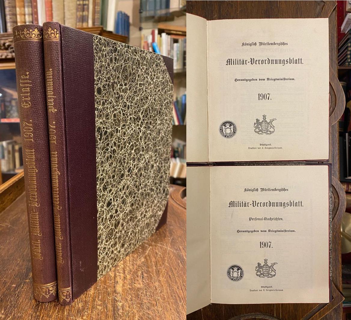 Militär-Verordnungsblatt, Königl. Württembergisches 1907. – Kriegsministerium (Hrsg): Königlich Württembergisches Militär-Verordnungsblatt 1907 [in zwei Bänden]: [Erlasse] Nr. 1 – 42 + Personal-Nachrichten Nr. 1 – 35 [so komplett]. 2 Bände in 2, Stuttgart, Druckerei des K. Kriegsministeriums, 1907. 8° (23x20), XXI, 294 + 47, 44; XIII, 112 S., marmor Hln d.Zt. mit goldRückenPrägung, dreiseitiger Rotschnitt, ohne Gebrauchsspuren, offensichtlich ungelesen, frisch, [= Königlich Württembergisches Militär-Verordnungsblatt : Erlasse + Personalia; 1907 : erscheinungsweise 1857 – 69.1919], kompletter Jahrgang, jeweils durch Register erschlossen.–