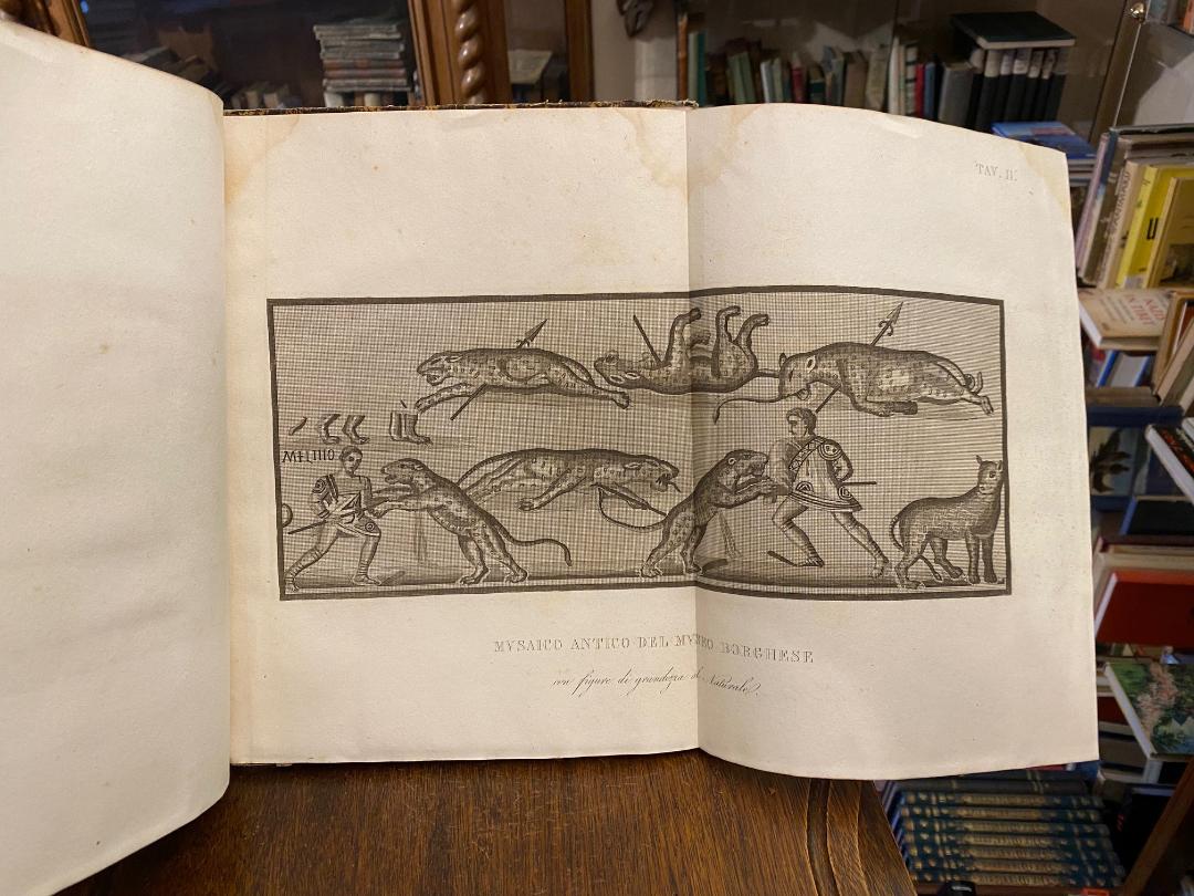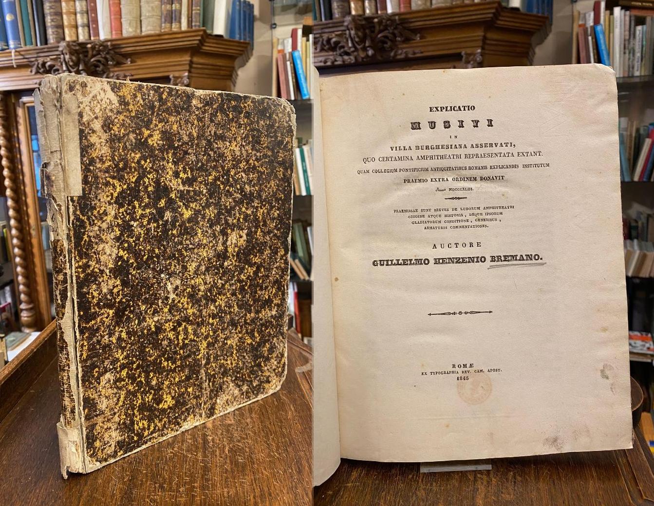 Henzen, Johann Heinrich Wilhelm (1816-1887) / Henzenio Bremano, Guillelmo: Explicatio Musivi in villa Burghesiana Asservati, quo certamina amphitheatri repraesentata extant. Quam Collegium pontificium antiquitatibus romanis explicandis institutum. Praemio extra ordinem donavit anno MDCCCXLIII. Praemisae sunt breves de ludorum amphitheatri origine atque historia, deque ipsorum gladiatorum conditione, generibus, armaturis commentationes. Romae, Ex typographia Rev. Cam. Apost., 1845. 4° (29x23), 89 S., + 7 gefaltete Tafeln, marmor Pbd d.Zt., Ecken/Kanten stark bestossen, Rücken beschädigt, Stempel verso Titel (Staatsbibliothek Bremen : wohl Kriegsverlust), wenige kleine Eckknicke, die Tafeln etwas angerändert, teils etwas stockfleckig und im Rand mit geringen Feuchtigkekitsspuren, ordentliches festes Exemplar,