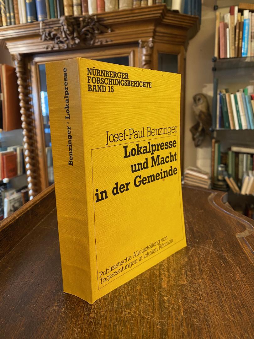 Benzinger, Josef-Paul: Lokalpresse und Macht in der Gemeinde : Publizistische Alleinstellung von Tageszeitungen in lokalen Räumen. Nürnberg, Verlag der Nürnberger Forschungsvereinigung e.V. / Münsterschwarzach, Viert-Türme-Verlag (Druck), 1980. 8° (21x15), XII,. 689, 50 S., OKart (Brosch), Umschlag etwas angeschmutzt, sonst fest und sauber, [= Nürnberger Forschungsberichte; 15 / zgl. Dissertation Universität Erlangen/ Nürnberg: Fachbereich Wirtschafts- und Sozialwissenschaften],