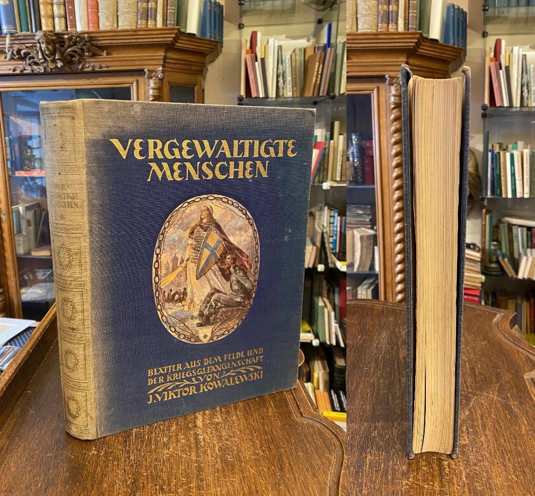 Kowalewski, J. Viktor (Hrsg): Vergewaltigte Menschen : Blätter aus dem Feld und der Kriegsgefangenschaft. Wien; München, Amon Franz Göth, 1926. 4° (31x24), (X), 336 S., mit 93 Abb. auf 44 Tafeln und 6 farb Kunstbeilagen, blauer Oln mit montiertem Deckelbild und goldPrägung, SchmuckVorsätze, Einband lichtrandig und gering angeschmutzt, geringe Lesespuren, fest und sauber,