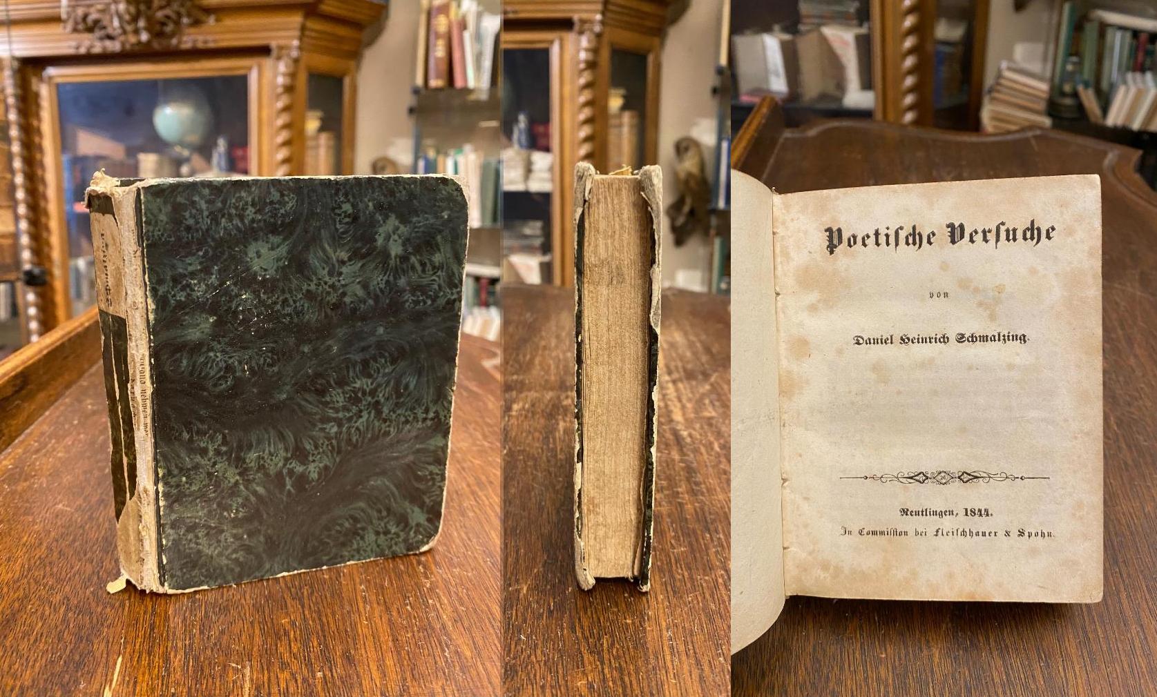 Schmalzing, Daniel Heinrich: Poetische Versuche. Reutlingen, In Commission bei Fleischhauer & Spohn, 1844. 12° (13x11), XVI, 378 S., 2 (von 4) Bl. Register, marmor Pbd. d.Zt., Ecken/Kanten bestossen, Rückenbezug schadhaft, ordentliches Exemplar, [Kuhn, Bedeutende Biberacher; 34 f].– Biberacher Volksdichter Daniel Heinrich Schmalzing (1812-1870).– Am bekanntesten wurde sein satirisches Gedicht ‚Franzosen-Samstag‘, das der Maler Hermann Volz mit Bildern schmückte.–