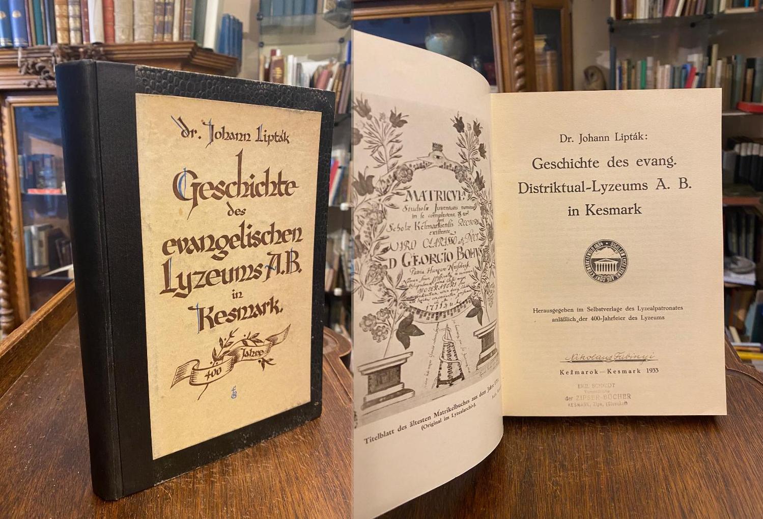 Kesmark / Kesmarok. – Liptak, Johann: Geschichte des evangelischen Distriktual-Lyzeums A. B. in Kesmark. Herausgegeben im Selbstverlage des Lyzealpatronates anläßlich der 400-Jahrfeier des Lyzeums. Kezmarok – Kesmark, Selbstverlag, 1933. gr8° (24x18), VII, 237 S., mit 10 Tafeln, Hln d.Zt. mit aufmontiertem OU, Name auf Titelblatt, fest sauber und gepflegt,