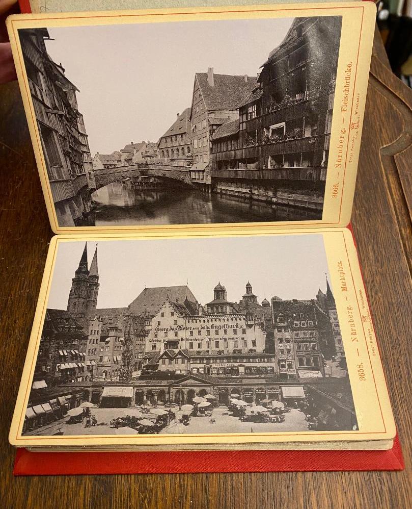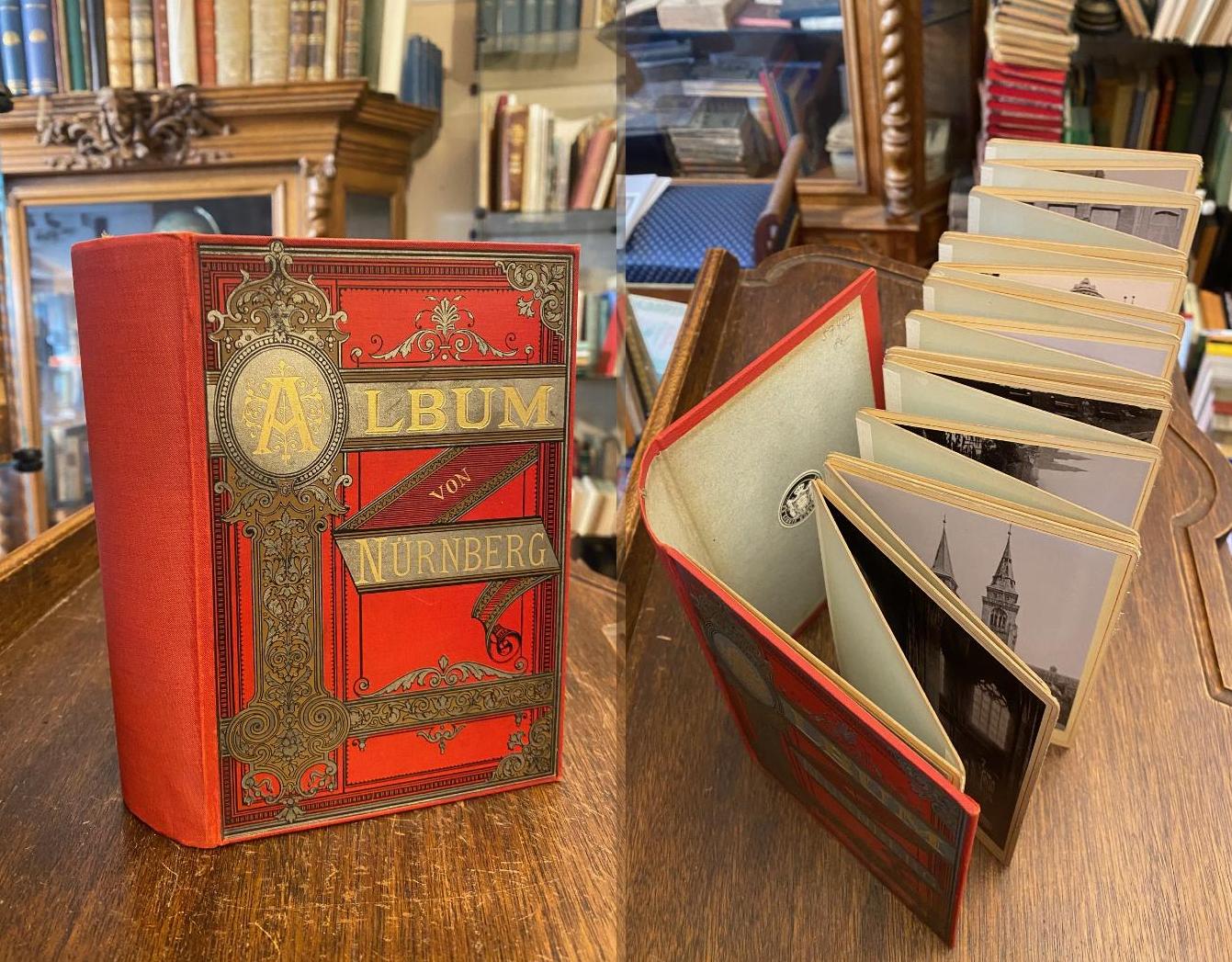 Album von Nürnberg : [Leporello mit 34 fotografischen Aufnahmen]. Wiesbaden, Ernst Roepke, [um 1890]. 8° (17.5x12), die Fotografien etwa 14.5 x 10 cm auf Hartkarton 16.5 x 11 cm, Historismuseinband: roter Oln gewachst mit ornamentaler Verzierung und goldPrägung, sauber und frisch, schönes gepflegtes Exemplar,