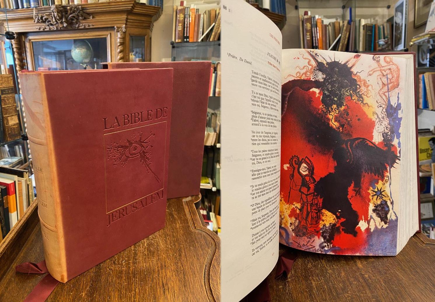 Bibel. – AT. – NT. – Bible, Jerusalem. – (La Bible de Jerusalem) : La Sainte Bible : Traduite en francais sous la direction de l’Ecole Biblique de Jerusalem. (Illustration de Salvador Dali). [Paris], Denoel, 1972 4° (28x20), XVI, 1458 p., textes sur 2 colonnes, avec 40 planches en couleur, reliure d’editeur en plein cuir rouge fonce, gardes en velours, dans un etui en velours, dos allege / decolore, sinon tres bon,