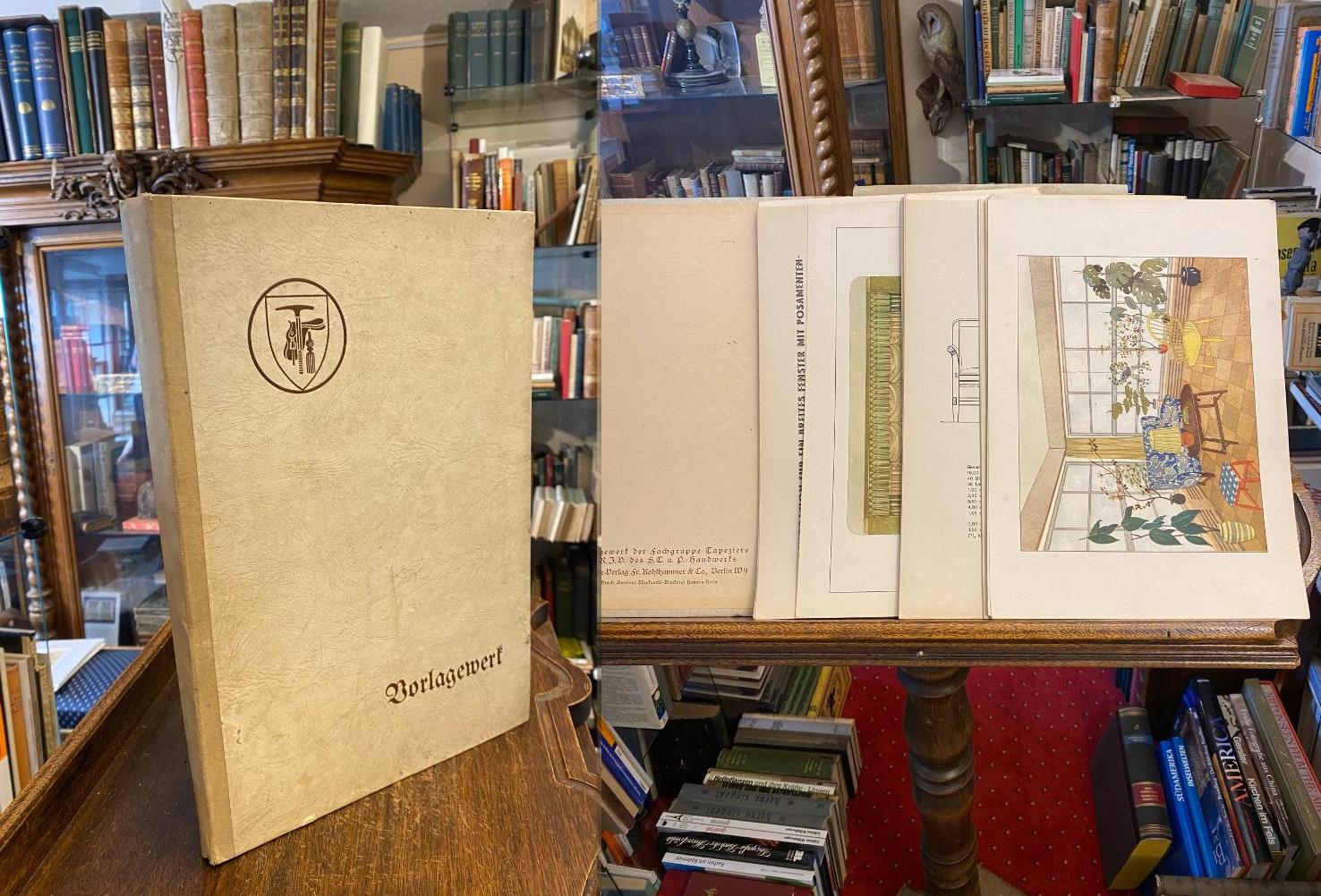 Fachgruppe Tapeziere im Reichsinnungsverband des Sattler- Taperzierer- und Polsterer-Handwerks (Hrsg): Vorlagewerk : Vorlagewerk der Fachgruppe Tapeziere im R. I. V. des S. T. u. P.-Handwerks. Berlin, Kondradin-Verlag : Friedrich Kohlhammer & Co / Berliner Merkantil-Druckerei : Hannes Helm (Druck), [1937]. 4° (35x25), mit 24 (davon 23 farb) Tafeln, sowie 23 Textblatt, OFlügelmappe mit Leinenrücken und Titeldruck, gering angestaubt/berieben, gutes Exemplar, Illustrationen von meist von F. Feldmann und Alfred Bungardt.–